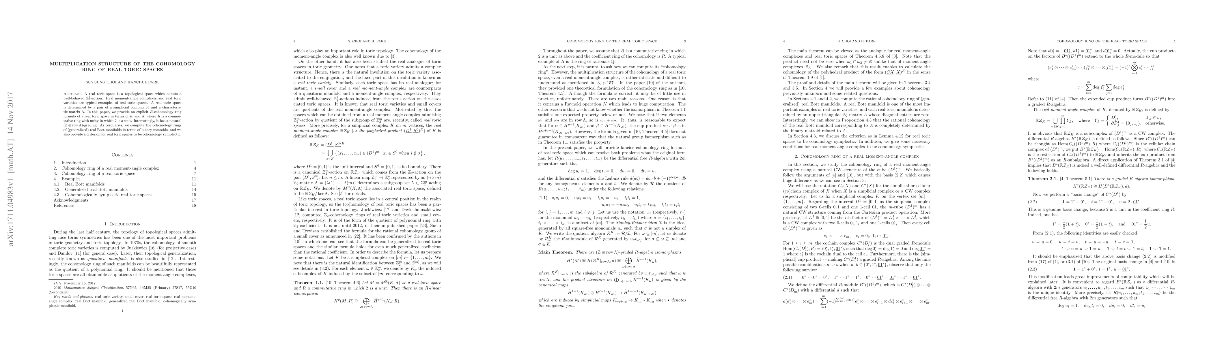 This paper presents an explicit formula for the $R$-cohomology ring of real toric spaces using a simplicial complex $K$ and a characteristic matrix $\Lambda$, revealing a $(\mathbb{Z} \oplus \operatorname*{row} \Lambda)$-grading. It also computes cohomology rings for generalized real Bott manifolds and provides a criterion for cohomology symplecticity.