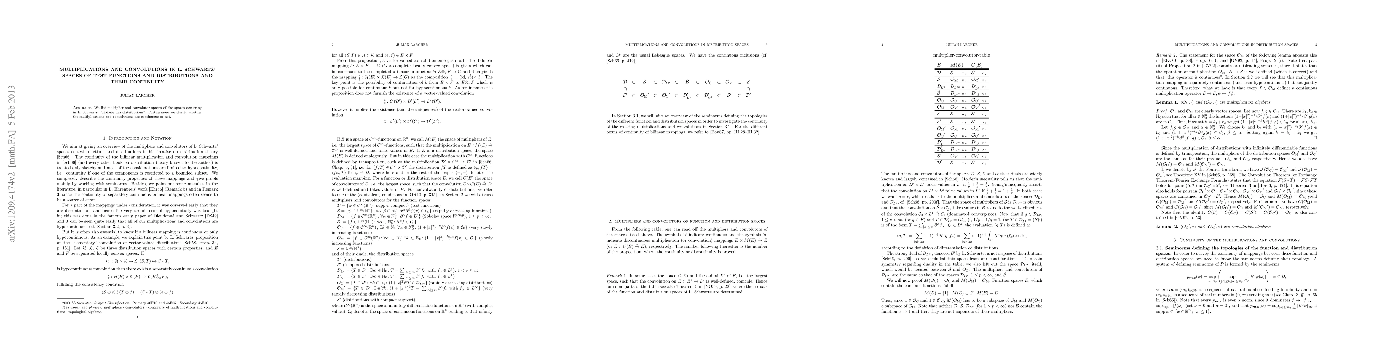 We list multiplier and convolutor spaces of the spaces occurring in L. Schwartz' "Th\'eorie des distributions". Furthermore we clarify whether the multiplications and convolutions are continuous or not.