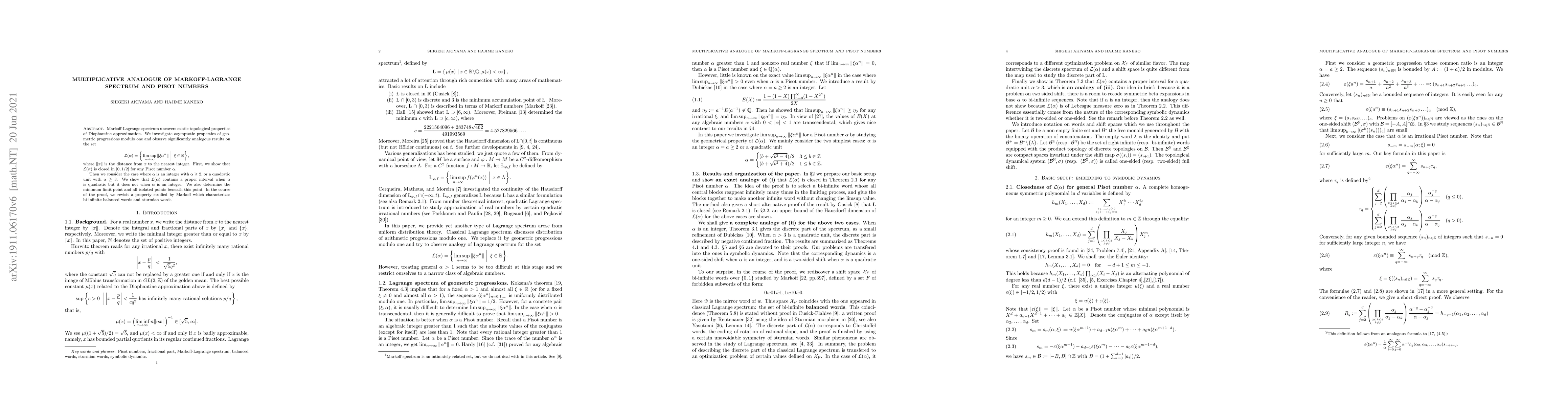Markoff-Lagrange spectrum uncovers exotic topological properties of Diophantine approximation. We investigate asymptotic properties of geometric progressions modulo one and observe significantly analogous results on the set \[ {\mathcal L}(\alpha)=\left\{\left.\limsup_{n\to \infty}\|\xi \alpha^n\|\ \right|\ \xi\in {\mathbb R}\right\}, \] where $\|x\|$ is the distance from $x$ to the nearest integer. First, we show that ${\mathcal L}(\alpha)$ is closed in $[0,1/2]$ for any Pisot number $\alpha$. Then we consider the case where $\alpha$ is an integer with $\alpha\geq 2$, or a quadratic unit with $\alpha\ge 3$. We show that ${\mathcal L}(\alpha)$ contains a proper interval when $\alpha$ is quadratic but it does not when $\alpha$ is an integer. We also determine the minimum limit point and all isolated points beneath this point. In the course of the proof, we revisit a property studied by Markoff which characterizes bi-infinite balanced words and sturmian words.