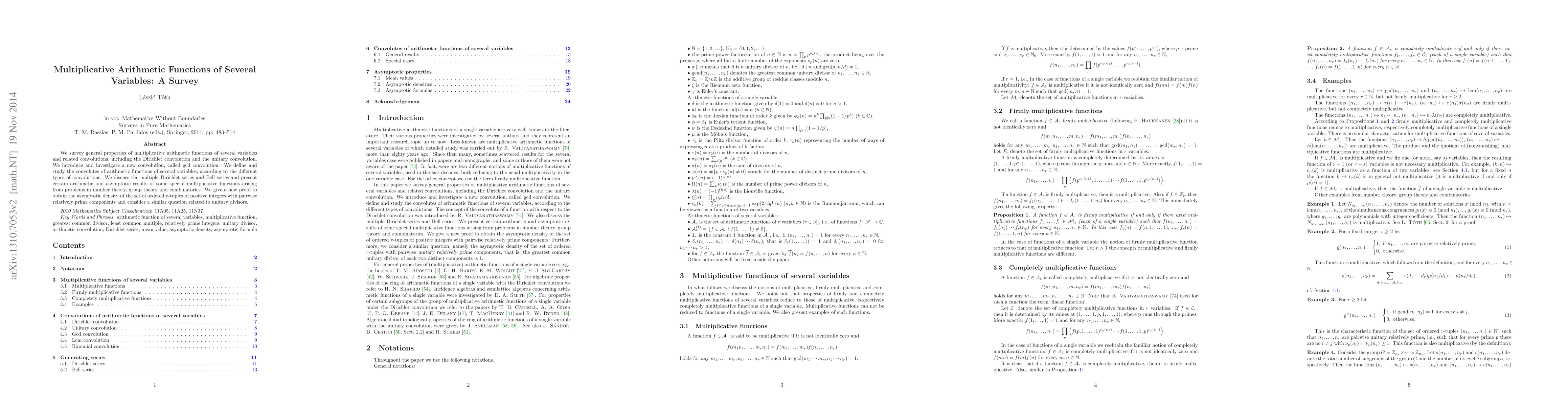 This paper surveys properties of multiplicative arithmetic functions with several variables, introducing and analyzing new convolutions like the gcd convolution. It also discusses multiple Dirichlet series, Bell series, and presents arithmetic results for special functions, including a new proof for the asymptotic density of ordered tuples with pairwise relatively prime components.