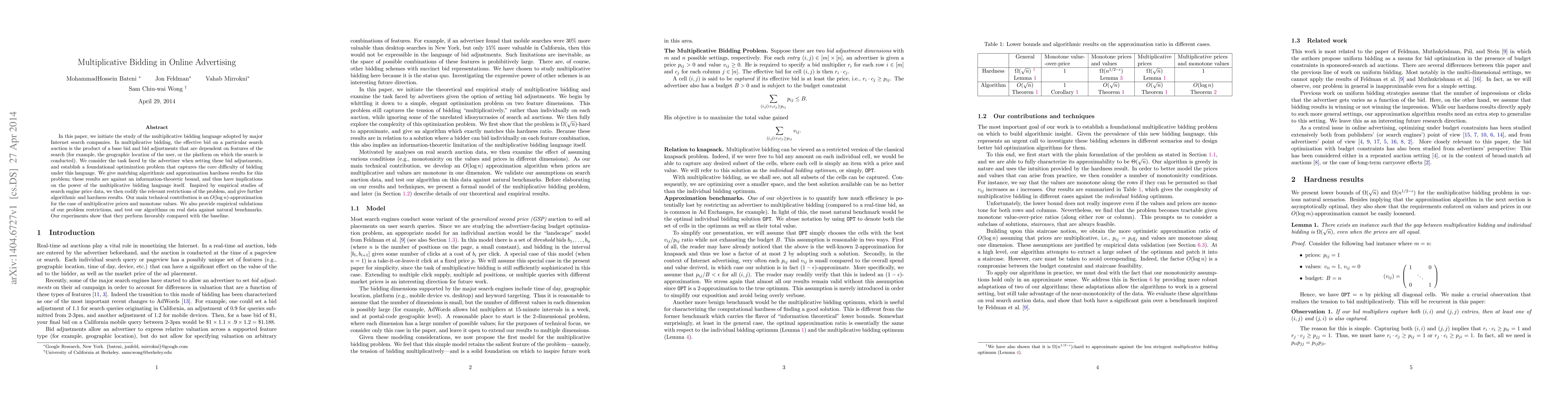 In this paper, we initiate the study of the multiplicative bidding language adopted by major Internet search companies. In multiplicative bidding, the effective bid on a particular search auction is the product of a base bid and bid adjustments that are dependent on features of the search (for example, the geographic location of the user, or the platform on which the search is conducted). We consider the task faced by the advertiser when setting these bid adjustments, and establish a foundational optimization problem that captures the core difficulty of bidding under this language. We give matching algorithmic and approximation hardness results for this problem; these results are against an information-theoretic bound, and thus have implications on the power of the multiplicative bidding language itself. Inspired by empirical studies of search engine price data, we then codify the relevant restrictions of the problem, and give further algorithmic and hardness results. Our main technical contribution is an $O(\log n)$-approximation for the case of multiplicative prices and monotone values. We also provide empirical validations of our problem restrictions, and test our algorithms on real data against natural benchmarks. Our experiments show that they perform favorably compared with the baseline.