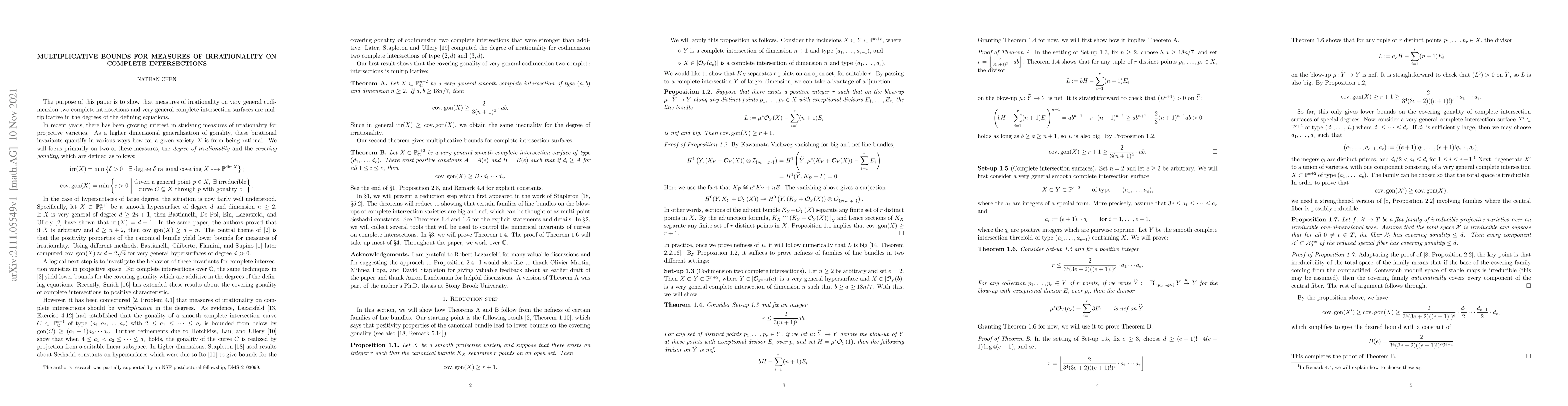 Summary: This paper establishes multiplicative bounds for measures of irrationality on codimension two complete intersections and surfaces, confirming specific cases of a conjecture. The research employs the study of numerical invariants of curves on these intersections.