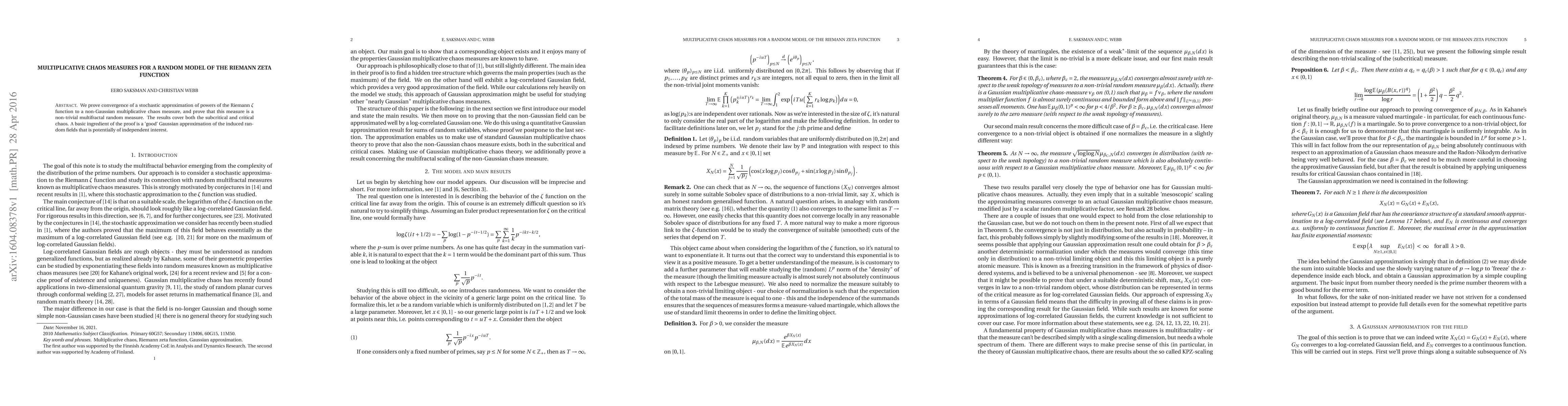 This paper proves the convergence of a stochastic model of powers of the Riemann zeta function to a non-Gaussian multiplicative chaos measure, establishing it as a non-trivial multifractal random measure. The study covers both subcritical and critical chaos, with a key component being a 'good' Gaussian approximation of the induced random fields.