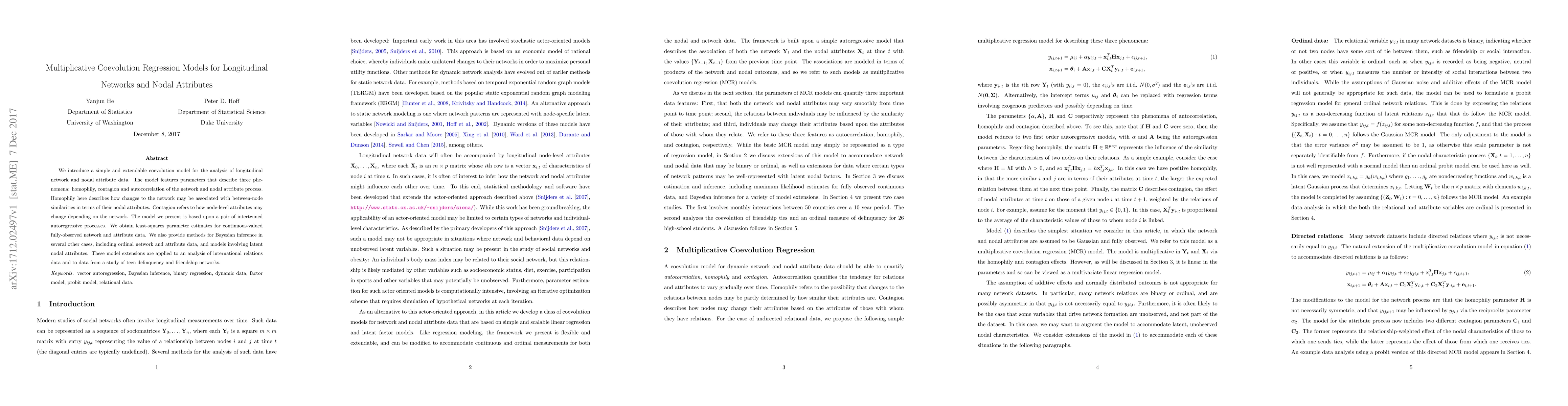 This paper introduces a coevolution regression model for analyzing longitudinal network and nodal attribute data, incorporating parameters for homophily, contagion, and autocorrelation. It employs intertwined autoregressive processes and provides least-squares and Bayesian inference methods for various data types, demonstrating applications to international relations and teen delinquency data.