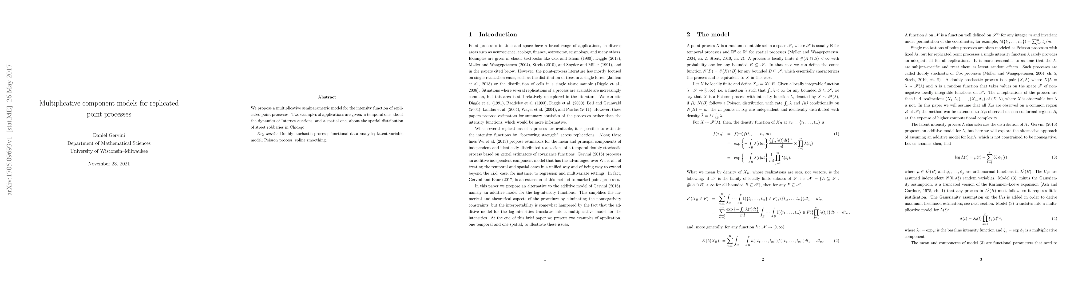 Summary: This paper introduces a multiplicative semiparametric model for the intensity function of replicated point processes, demonstrating its application in analyzing the dynamics of Internet auctions and the spatial distribution of street robberies in Chicago.