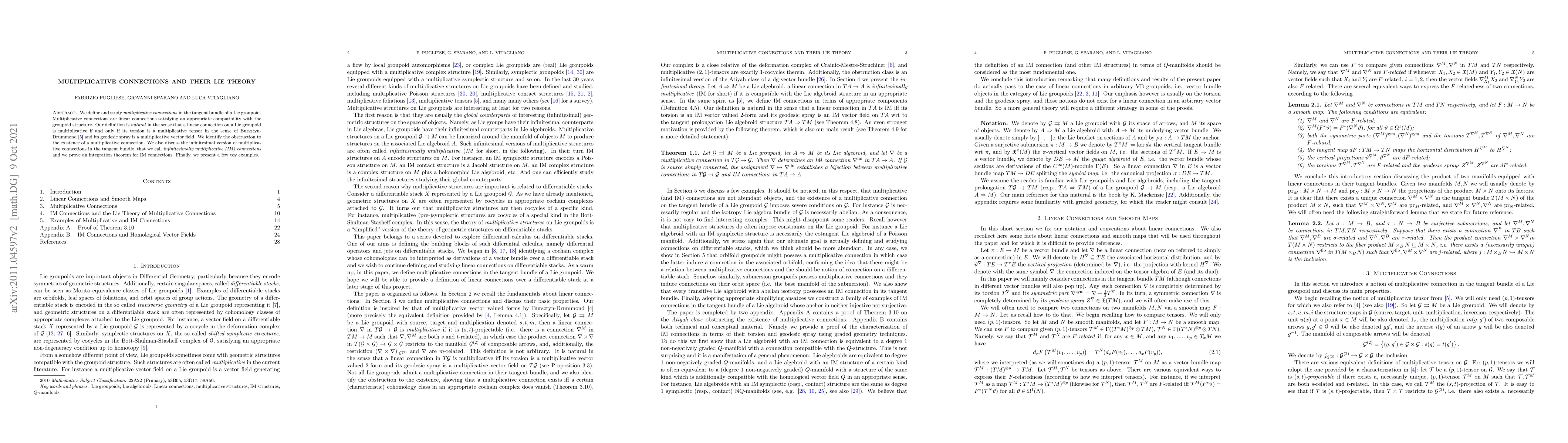 This paper introduces multiplicative connections in the tangent bundle of a Lie groupoid, defining them through compatibility with the groupoid structure. It identifies obstructions to their existence and discusses infinitesimally multiplicative connections, proving an integration theorem for these. Toy examples are provided to illustrate the concepts.