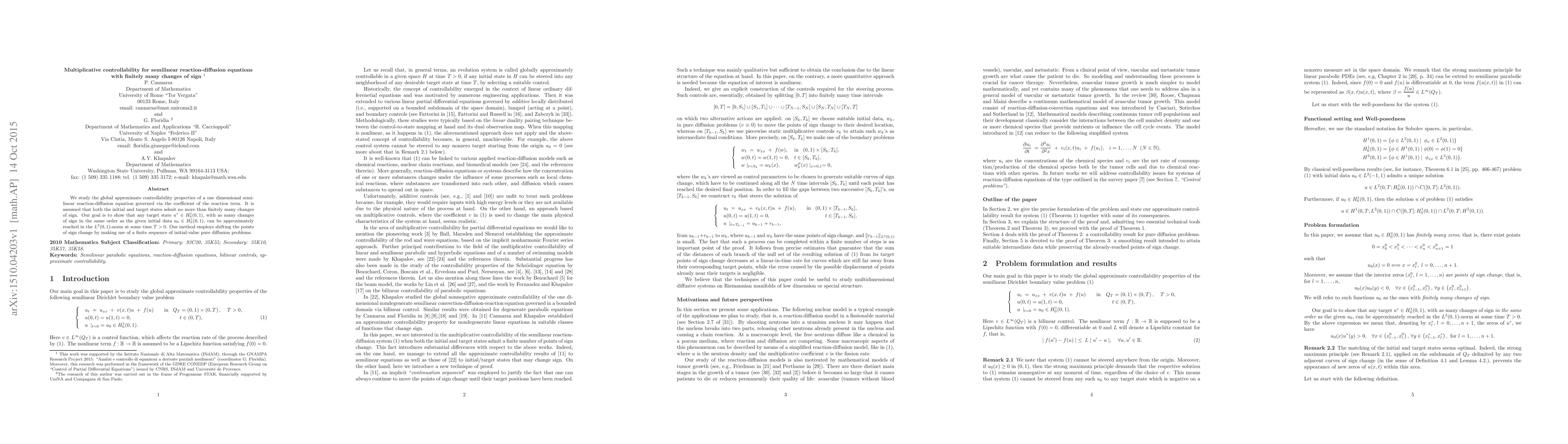 This paper investigates the global approximate controllability of a one-dimensional semilinear reaction-diffusion equation by manipulating the reaction term's coefficient. It demonstrates that target states with the same number of sign changes as the initial state can be reached approximately in the $L^2$ norm through a sequence of diffusion problems.
