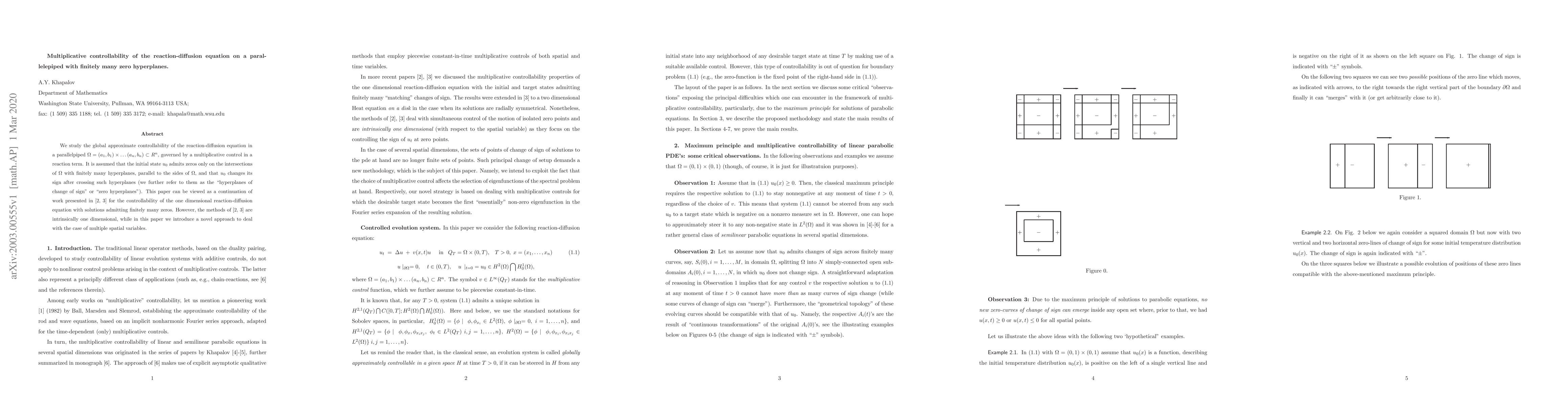 We study the global approximate controllability of the reaction-diffusion equation in a parallelpiped $ \Omega = (a_1,b_1 ) \times \ldots (a_n,b_n) \subset R^n $, governed by a multiplicative control in a reaction term. It is assumed that the initial state $ u_0 $ admits zeros only on the intersections of $ \Omega$ with finitely many hyperplanes, parallel to the sides of $ \Omega$, and that $ u_0$ changes its sign after crossing such hyperplanes (we further refer to them as the "hyperplanes of change of sign" or "zero hyperplanes"). This paper can be viewed as a continuation of work presented in \cite{CanKh, CanKh2} for the controllability of the one dimensional reaction-diffusion equation with solutions admitting finitely many zeros. However, the methods of \cite{CanKh, CanKh2} are intrinsically one dimensional, while in this paper we introduce a novel approach to deal with the case of multiple spatial variables.