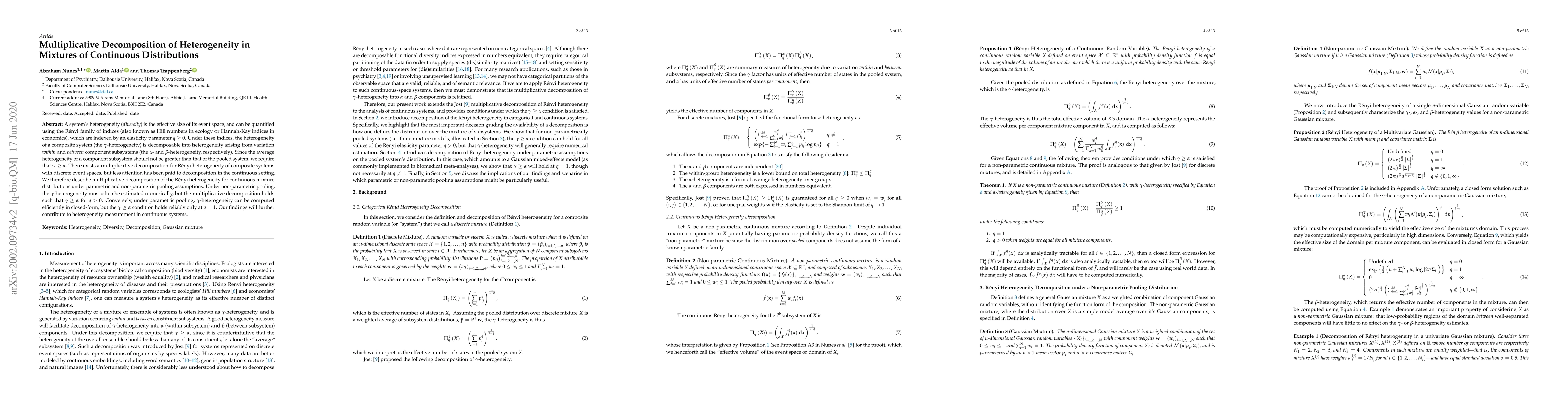 A system's heterogeneity (\textit{diversity}) is the effective size of its event space, and can be quantified using the R\'enyi family of indices (also known as Hill numbers in ecology or Hannah-Kay indices in economics), which are indexed by an elasticity parameter $q \geq 0$. Under these indices, the heterogeneity of a composite system (the $\gamma$-heterogeneity) is decomposable into heterogeneity arising from variation \textit{within} and \textit{between} component subsystems (the $\alpha$- and $\beta$-heterogeneity, respectively). Since the average heterogeneity of a component subsystem should not be greater than that of the pooled system, we require that $\gamma \geq \alpha$. There exists a multiplicative decomposition for R\'enyi heterogeneity of composite systems with discrete event spaces, but less attention has been paid to decomposition in the continuous setting. We therefore describe multiplicative decomposition of the R\'enyi heterogeneity for continuous mixture distributions under parametric and non-parametric pooling assumptions. Under non-parametric pooling, the $\gamma$-heterogeneity must often be estimated numerically, but the multiplicative decomposition holds such that $\gamma \geq \alpha$ for $q > 0$. Conversely, under parametric pooling, $\gamma$-heterogeneity can be computed efficiently in closed-form, but the $\gamma \geq \alpha$ condition holds reliably only at $q=1$. Our findings will further contribute to heterogeneity measurement in continuous systems.