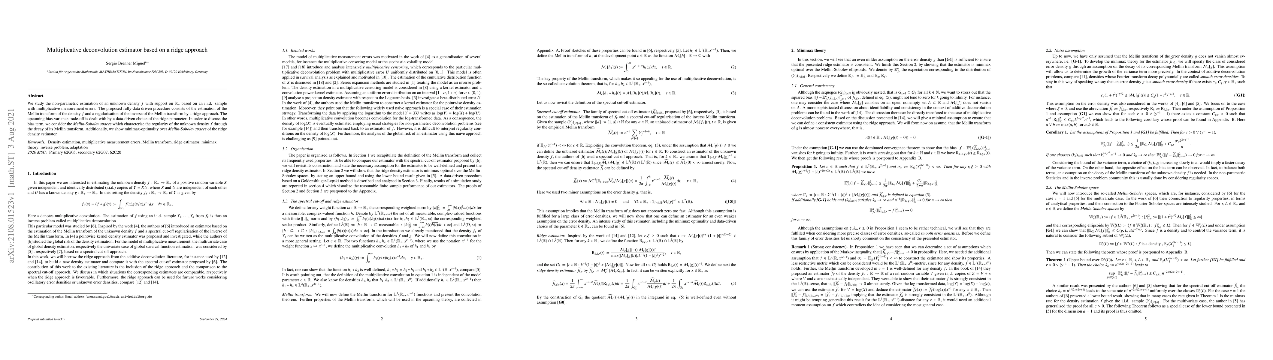 We study the non-parametric estimation of an unknown density f with support on R+ based on an i.i.d. sample with multiplicative measurement errors. The proposed fully-data driven procedure consists of the estimation of the Mellin transform of the density f and a regularisation of the inverse of the Mellin transform by a ridge approach. The upcoming bias-variance trade-off is dealt with by a data-driven choice of the ridge parameter. In order to discuss the bias term, we consider the Mellin-Sobolev spaces which characterise the regularity of the unknown density f through the decay of its Mellin transform. Additionally, we show minimax-optimality over Mellin-Sobolev spaces of the ridge density estimator.