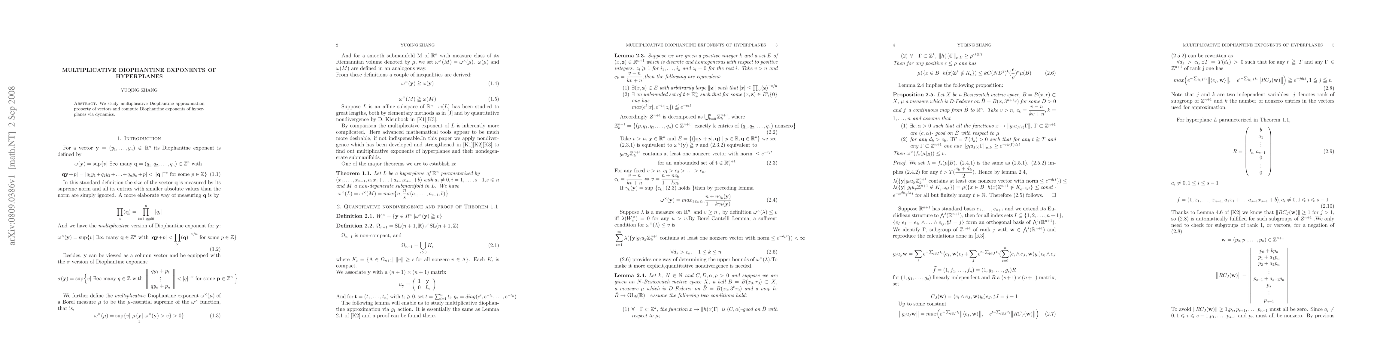 Summary: This paper investigates the multiplicative Diophantine approximation of vectors and determines the Diophantine exponents of hyperplanes through dynamical methods.