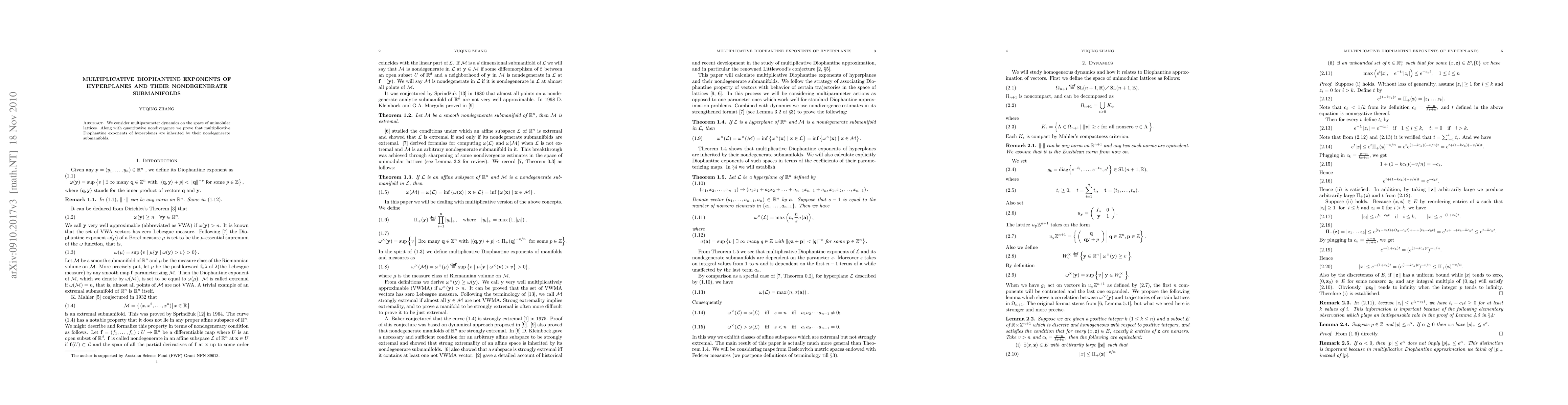 Summary: This paper investigates multiparameter dynamics on unimodular lattices, proving that multiplicative Diophantine exponents of hyperplanes are preserved in their nondegenerate submanifolds, alongside demonstrating quantitative nondivergence.