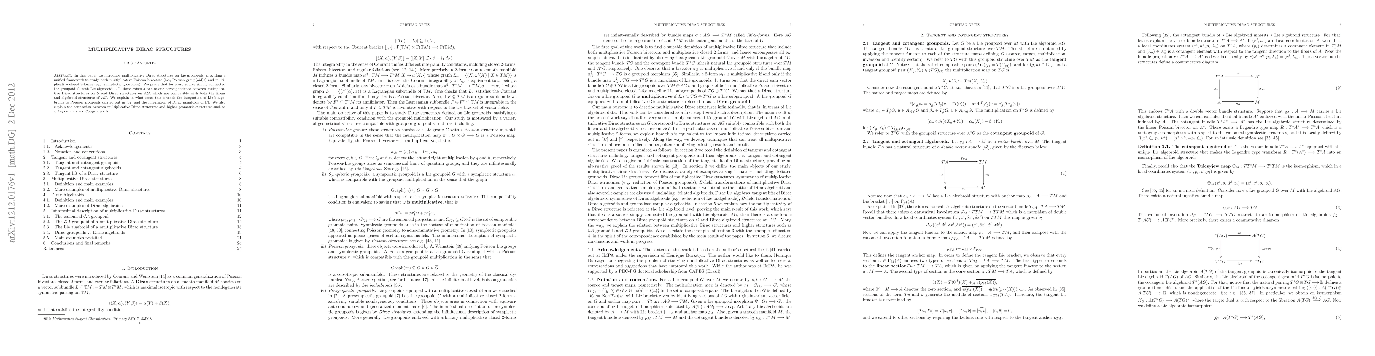 A new mathematical framework was developed to describe and analyze multiplicative Dirac structures on Lie groupoids.