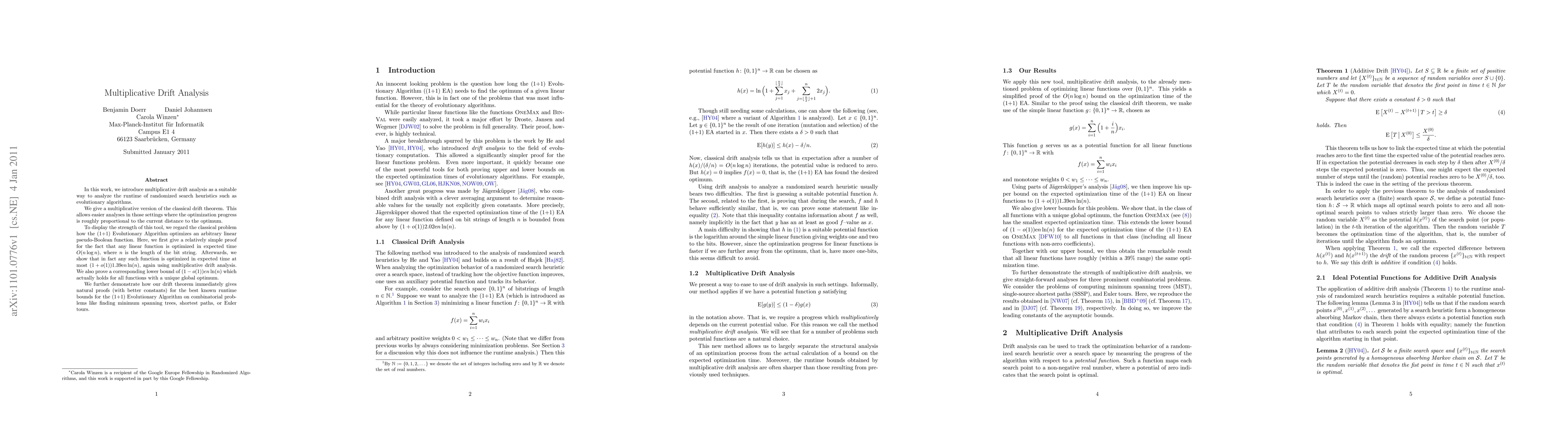 In this work, we introduce multiplicative drift analysis as a suitable way to analyze the runtime of randomized search heuristics such as evolutionary algorithms. We give a multiplicative version of the classical drift theorem. This allows easier analyses in those settings where the optimization progress is roughly proportional to the current distance to the optimum. To display the strength of this tool, we regard the classical problem how the (1+1) Evolutionary Algorithm optimizes an arbitrary linear pseudo-Boolean function. Here, we first give a relatively simple proof for the fact that any linear function is optimized in expected time $O(n \log n)$, where $n$ is the length of the bit string. Afterwards, we show that in fact any such function is optimized in expected time at most ${(1+o(1)) 1.39 \euler n\ln (n)}$, again using multiplicative drift analysis. We also prove a corresponding lower bound of ${(1-o(1))e n\ln(n)}$ which actually holds for all functions with a unique global optimum. We further demonstrate how our drift theorem immediately gives natural proofs (with better constants) for the best known runtime bounds for the (1+1) Evolutionary Algorithm on combinatorial problems like finding minimum spanning trees, shortest paths, or Euler tours.