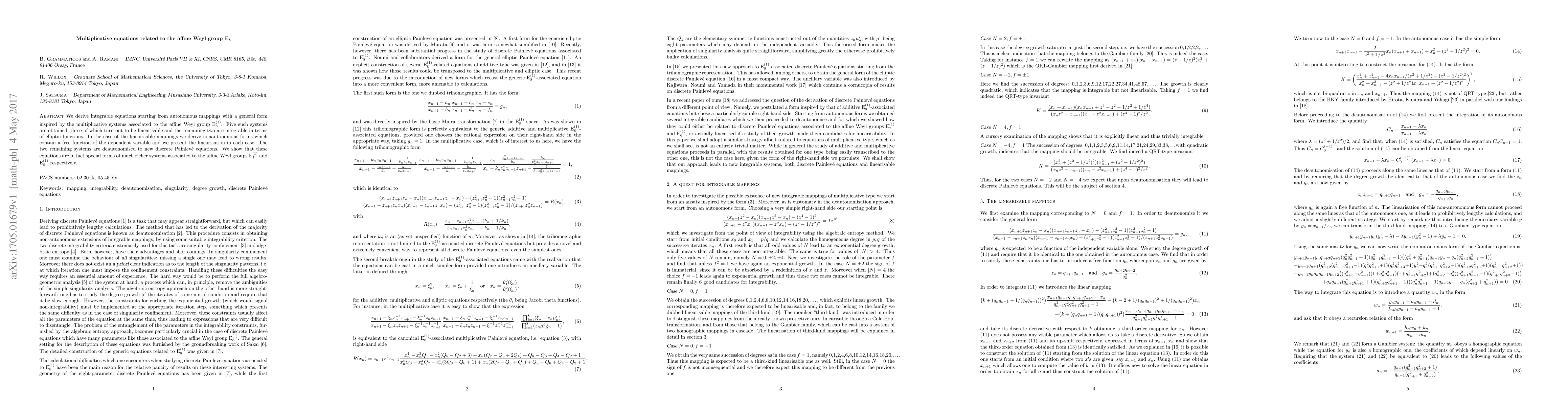 We derive integrable equations starting from autonomous mappings with a general form inspired by the multiplicative systems associated to the affine Weyl group E$_8^{(1)}$. Five such systems are obtained, three of which turn out to be linearisable and the remaining two are integrable in terms of elliptic functions. In the case of the linearisable mappings we derive nonautonomous forms which contain a free function of the dependent variable and we present the linearisation in each case. The two remaining systems are deautonomised to new discrete Painlev\'e equations. We show that these equations are in fact special forms of much richer systems associated to the affine Weyl groups E$_7^{(1)}$ and E$_8^{(1)}$ respectively.