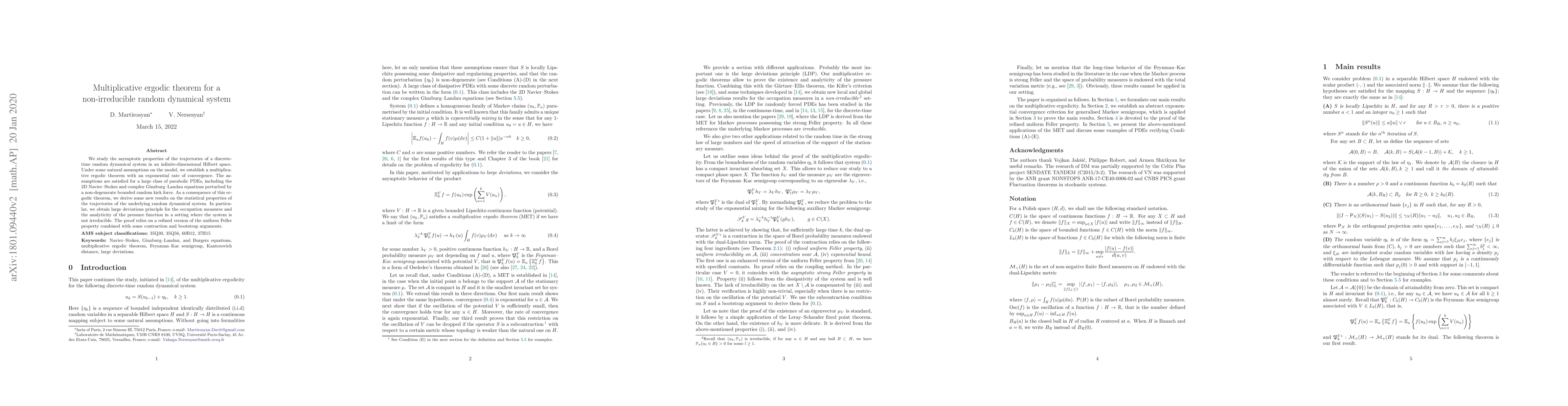 We study the asymptotic properties of the trajectories of a discrete-time random dynamical system in an infinite-dimensional Hilbert space. Under some natural assumptions on the model, we establish a multiplica-tive ergodic theorem with an exponential rate of convergence. The assumptions are satisfied for a large class of parabolic PDEs, including the 2D Navier--Stokes and complex Ginzburg--Landau equations perturbed by a non-degenerate bounded random kick force. As a consequence of this er-godic theorem, we derive some new results on the statistical properties of the trajectories of the underlying random dynamical system. In particular , we obtain large deviations principle for the occupation measures and the analyticity of the pressure function in a setting where the system is not irreducible. The proof relies on a refined version of the uniform Feller property combined with some contraction and bootstrap arguments.
