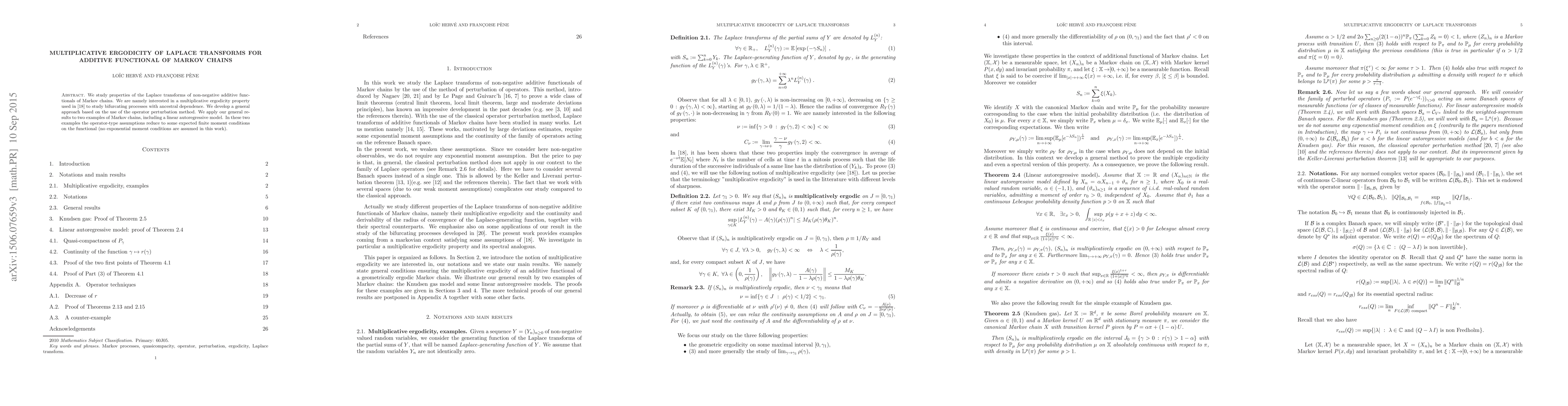 This paper investigates the multiplicative ergodicity property of Laplace transforms for non-negative additive functionals of Markov chains, employing an operator perturbation method. The authors apply their findings to two examples, including a linear autoregressive model, under finite moment conditions without requiring exponential moments.