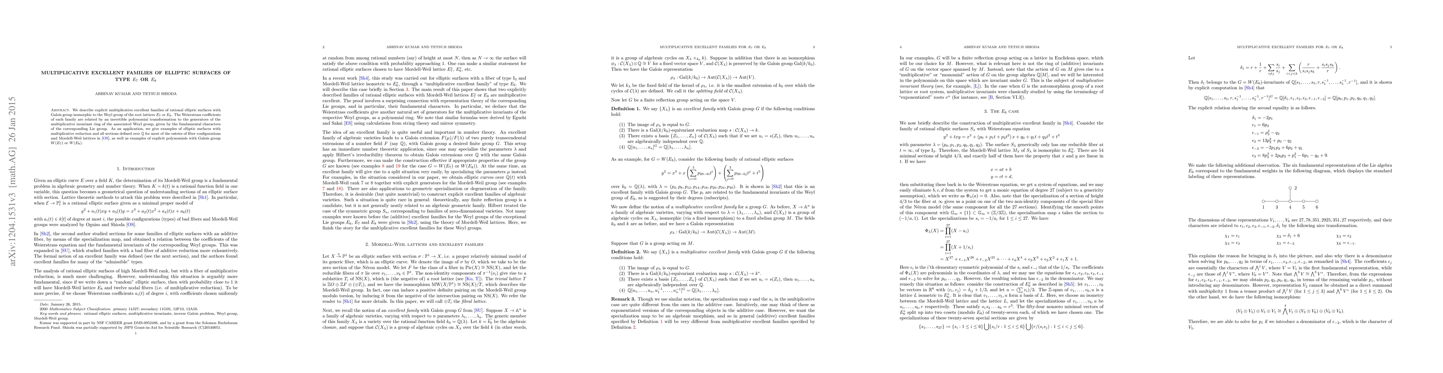 This paper introduces explicit multiplicative excellent families of rational elliptic surfaces associated with the Weyl groups of root lattices E_7 and E_8. The Weierstrass coefficients are transformed by invertible polynomials related to the fundamental characters of the corresponding Lie groups.