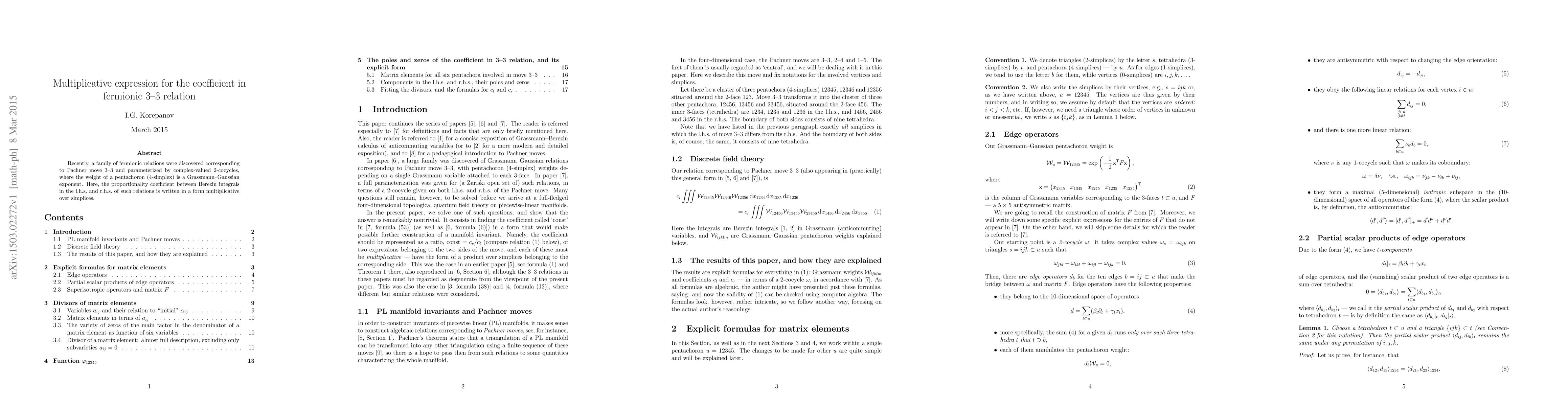 This paper introduces a multiplicative expression for the coefficient in fermionic 3-3 relations, which correspond to Pachner move 3-3 and involve complex-valued 2-cocycles, with the weight of a pentachoron represented as a Grassmann-Gaussian exponent. The coefficient is expressed multiplicatively over simplices.