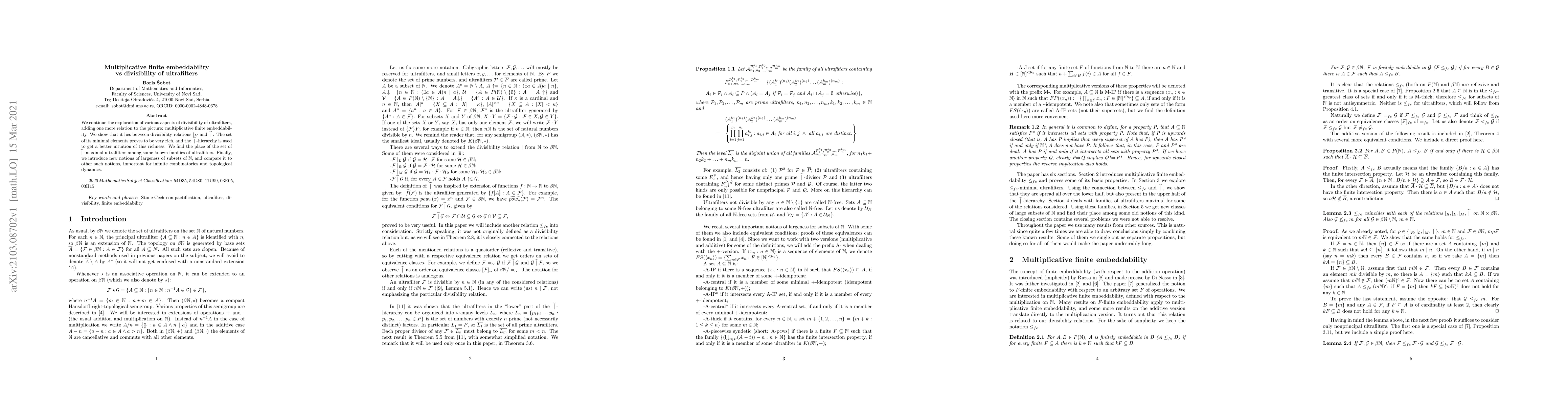 We continue the exploration of various aspects of divisibility of ultrafilters, adding one more relation to the picture: multiplicative finite embeddability. We show that it lies between divisibility relations $\mid_M$ and $\widetilde{\mid}$. The set of its minimal elements proves to be very rich, and the $\widetilde{\mid}$-hierarchy is used to get a better intuition of this richness. We find the place of the set of $\widetilde{\mid}$-maximal ultrafilters among some known families of ultrafilters. Finally, we introduce new notions of largeness of subsets of $\mathbb{N}$, and compare it to other such notions, important for infinite combinatorics and topological dynamics.