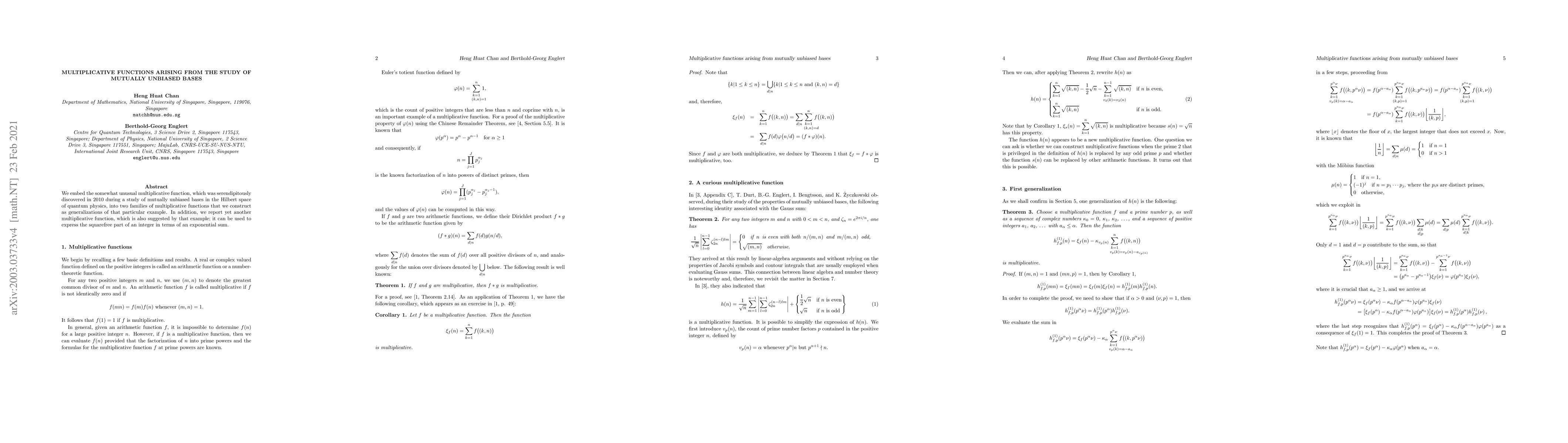 We embed the somewhat unusual multiplicative function, which was serendipitously discovered in 2010 during a study of mutually unbiased bases in the Hilbert space of quantum physics, into two families of multiplicative functions that we construct as generalizations of that particular example. In addition, we report yet another multiplicative function, which is also suggested by that example; it can be used to express the squarefree part of an integer in terms of an exponential sum.