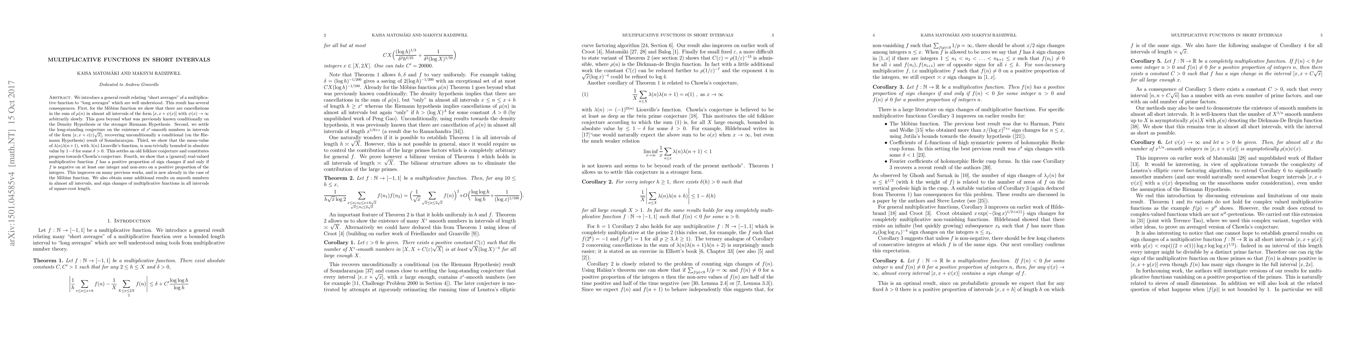 We introduce a general result relating "short averages" of a multiplicative function to "long averages" which are well understood. This result has several consequences. First, for the M\"obius function we show that there are cancellations in the sum of $\mu(n)$ in almost all intervals of the form $[x, x + \psi(x)]$ with $\psi(x) \rightarrow \infty$ arbitrarily slowly. This goes beyond what was previously known conditionally on the Density Hypothesis or the stronger Riemann Hypothesis. Second, we settle the long-standing conjecture on the existence of $x^{\epsilon}$-smooth numbers in intervals of the form $[x, x + c(\varepsilon) \sqrt{x}]$, recovering unconditionally a conditional (on the Riemann Hypothesis) result of Soundararajan. Third, we show that the mean-value of $\lambda(n)\lambda(n+1)$, with $\lambda(n)$ Liouville's function, is non-trivially bounded in absolute value by $1 - \delta$ for some $\delta > 0$. This settles an old folklore conjecture and constitutes progress towards Chowla's conjecture. Fourth, we show that a (general) real-valued multiplicative function $f$ has a positive proportion of sign changes if and only if $f$ is negative on at least one integer and non-zero on a positive proportion of the integers. This improves on many previous works, and is new already in the case of the M\"obius function. We also obtain some additional results on smooth numbers in almost all intervals, and sign changes of multiplicative functions in all intervals of square-root length.