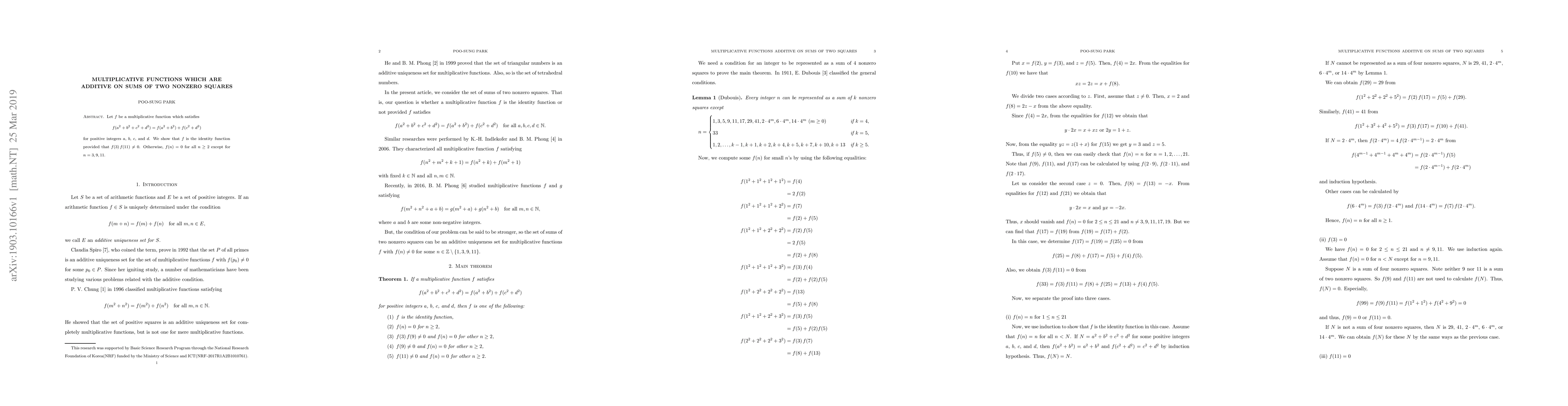 The main technical contribution is the characterization of multiplicative functions that are additive on sums of two nonzero squares, which provides new insights into number theory and arithmetic functions.
