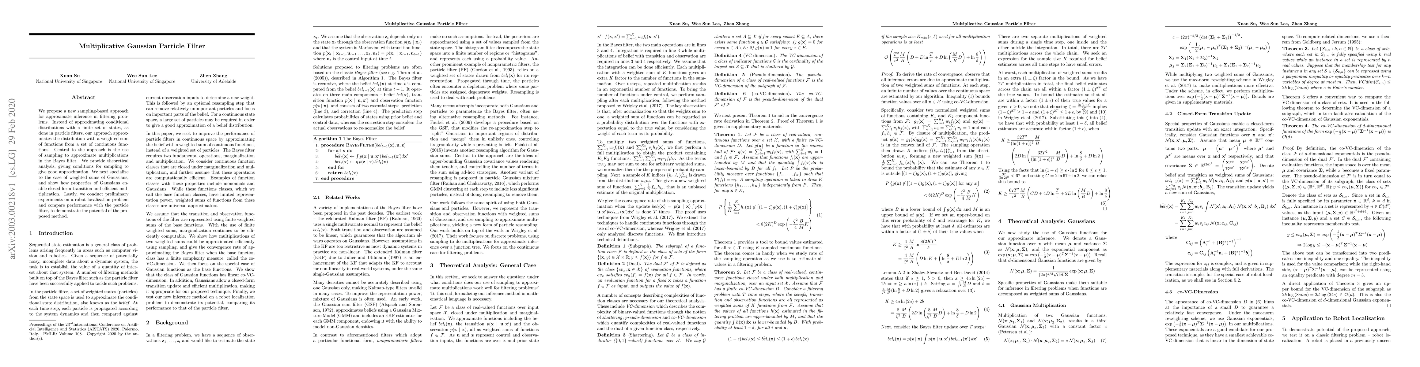 The paper introduces a novel multiplicative Gaussian Particle Filter for approximate inference in filtering problems, using a weighted sum of continuous functions instead of discrete states. It demonstrates theoretical conditions for effective sampling and specialization to Gaussians, showcasing efficient multiplication and transition properties, followed by preliminary experiments comparing its performance to traditional particle filters.