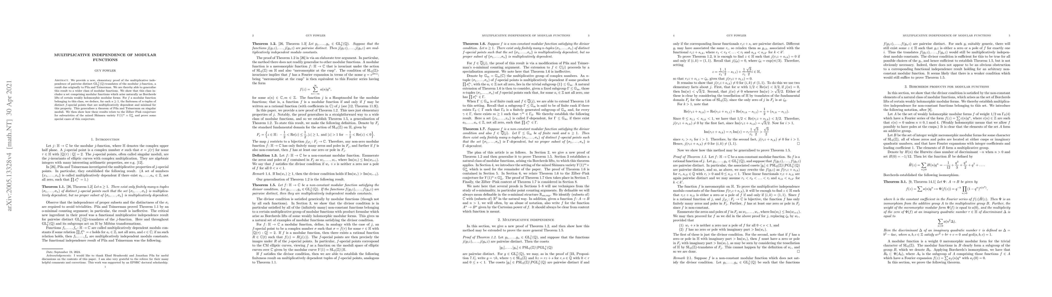 This paper provides an elementary proof of the multiplicative independence of distinct $\mathrm{GL}_2^+(\mathbb{Q})$-translates of the modular $j$-function, generalising the result to a broader class of modular functions, including Borcherds lifts. It also establishes the finiteness of $n$-tuples of distinct $f$-special points that are multiplicatively dependent, and relates these findings to the Zilber--Pink conjecture for subvarieties of the mixed Shimura variety.