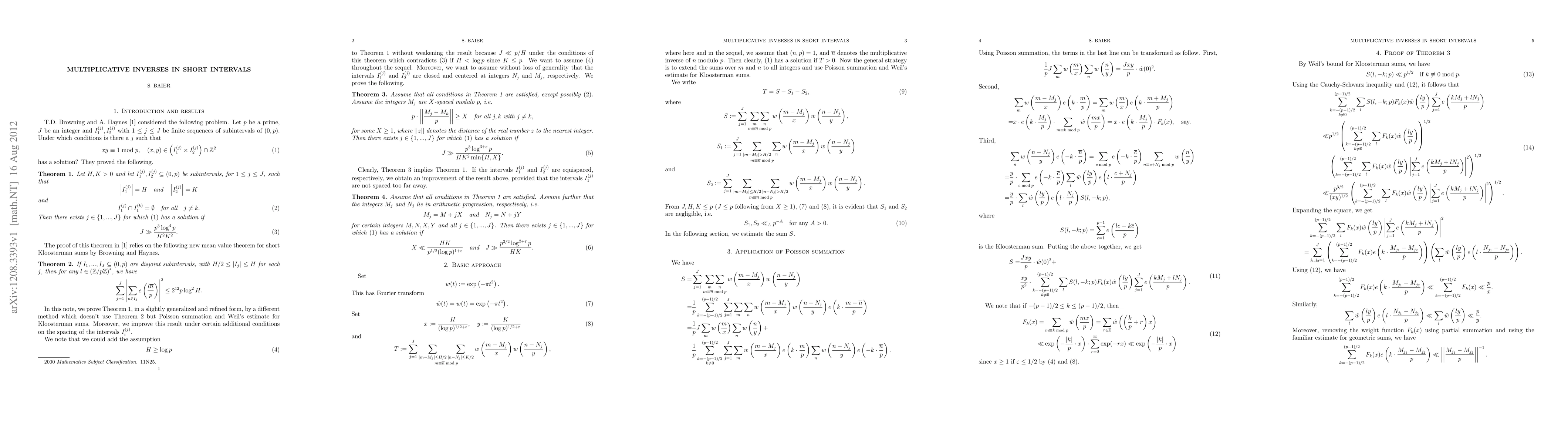 The work builds upon previous findings by Browning and Haynes, offering enhanced conditions and proofs for multiplicative inverses in short intervals.