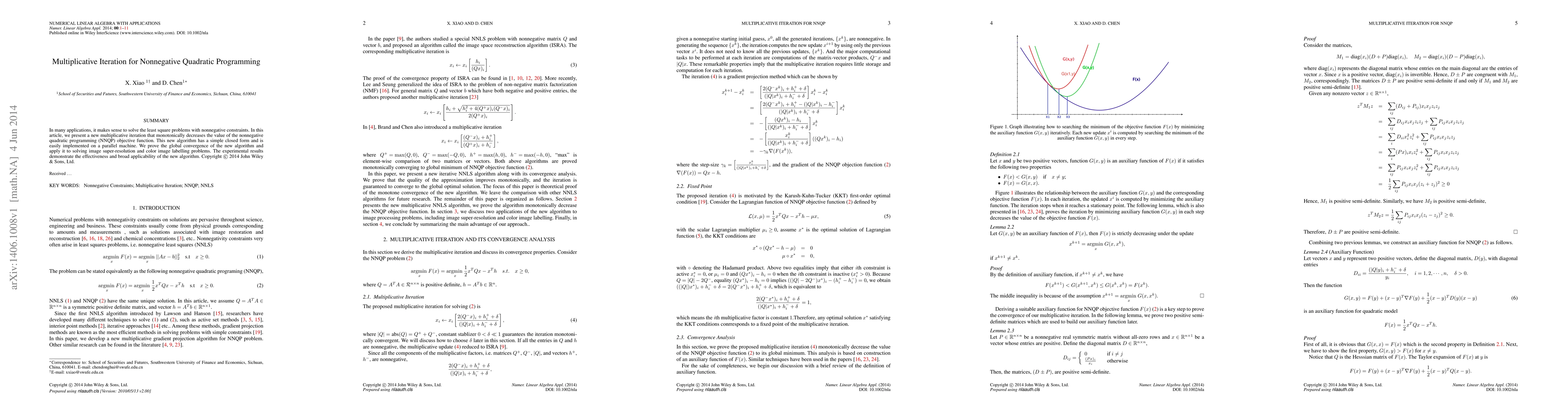 This paper introduces a new multiplicative iteration algorithm for solving nonnegative quadratic programming, proving its global convergence and demonstrating its effectiveness in image super-resolution and color image labeling through experiments. The algorithm is simple, parallelizable, and applicable to various least square problems with nonnegative constraints.