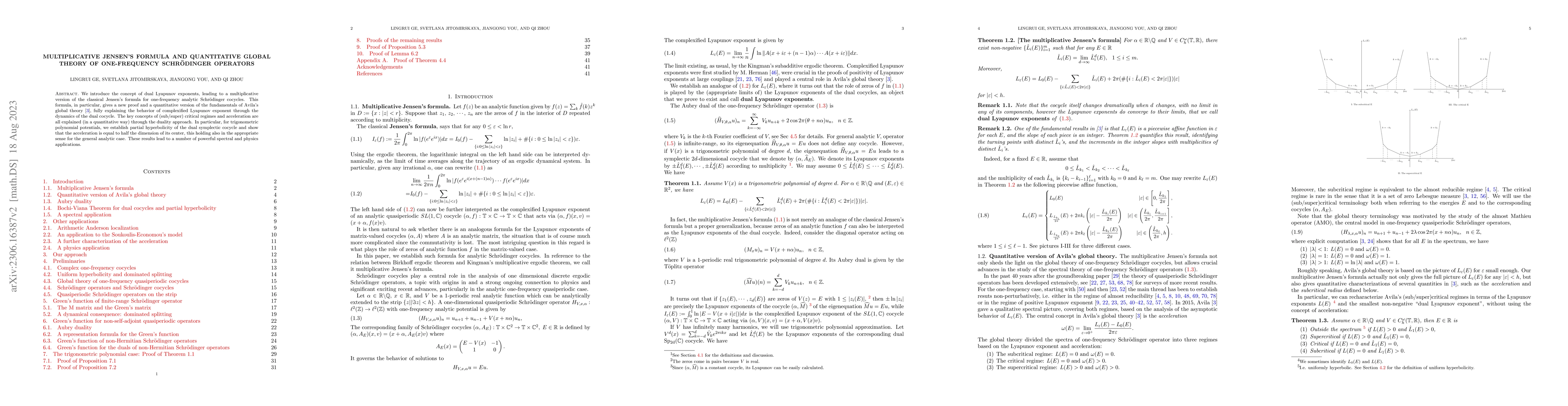 We introduce the concept of dual Lyapunov exponents, leading to a multiplicative version of the classical Jensen's formula for one-frequency analytic Schr\"odinger cocycles. This formula, in particular, gives a new proof and a quantitative version of the fundamentals of Avila's global theory \cite{avila}, fully explaining the behavior of complexified Lyapunov exponent through the dynamics of the dual cocycle. In particular, concepts of (sub/super) critical regimes and acceleration are all explained (in a quantitative way) through the duality approach. This leads to a number of powerful spectral and physics applications
