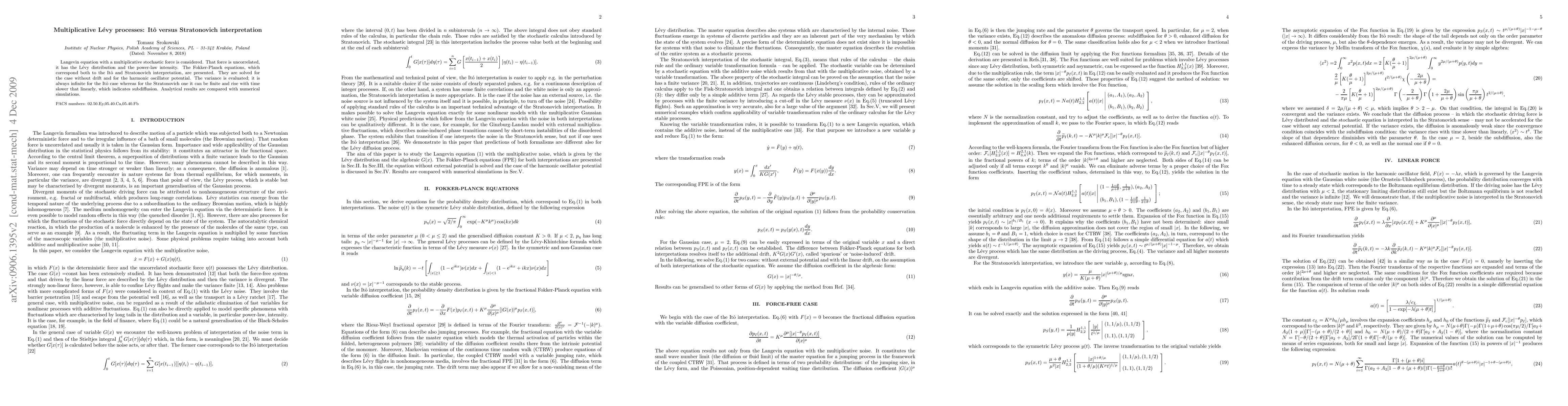 Langevin equation with a multiplicative stochastic force is considered. That force is uncorrelated, it has the L\'evy distribution and the power-law intensity. The Fokker-Planck equations, which correspond both to the It\^o and Stratonovich interpretation of the stochastic integral, are presented. They are solved for the case without drift and for the harmonic oscillator potential. The variance is evaluated; it is always infinite for the It\^o case whereas for the Stratonovich one it can be finite and rise with time slower that linearly, which indicates subdiffusion. Analytical results are compared with numerical simulations.