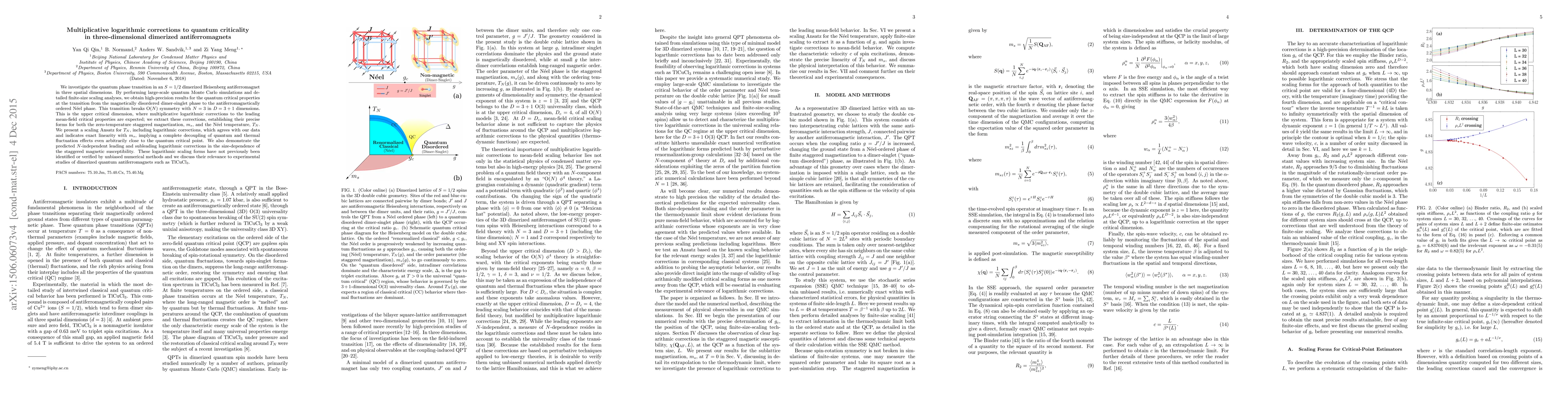 This paper investigates quantum criticality in three-dimensional dimerized antiferromagnets, revealing multiplicative logarithmic corrections to critical properties using quantum Monte Carlo simulations. It establishes precise forms for these corrections in the staggered magnetization and Neel temperature, demonstrating their linearity and relevance to experimental studies of materials like TlCuCl$_3$.