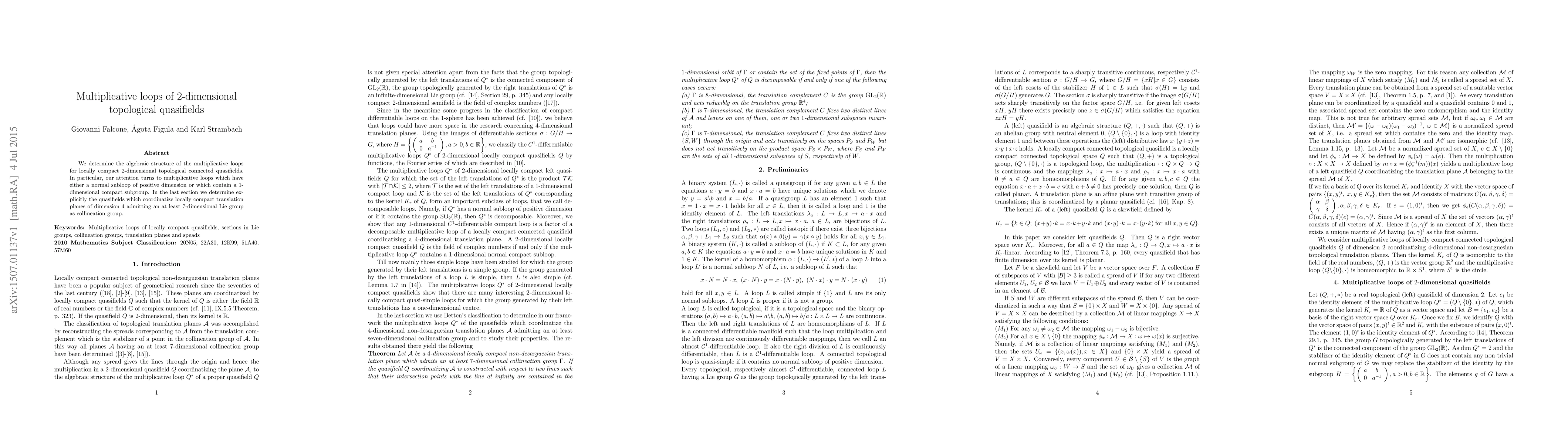 We determine the algebraic structure of the multiplicative loops for locally compact $2$-dimensional topological connected quasifields. In particular, our attention turns to multiplicative loops which have either a normal subloop of positive dimension or which contain a $1$-dimensional compact subgroup. In the last section we determine explicitly the quasifields which coordinatize locally compact translation planes of dimension $4$ admitting an at least $7$-dimensional Lie group as collineation group.