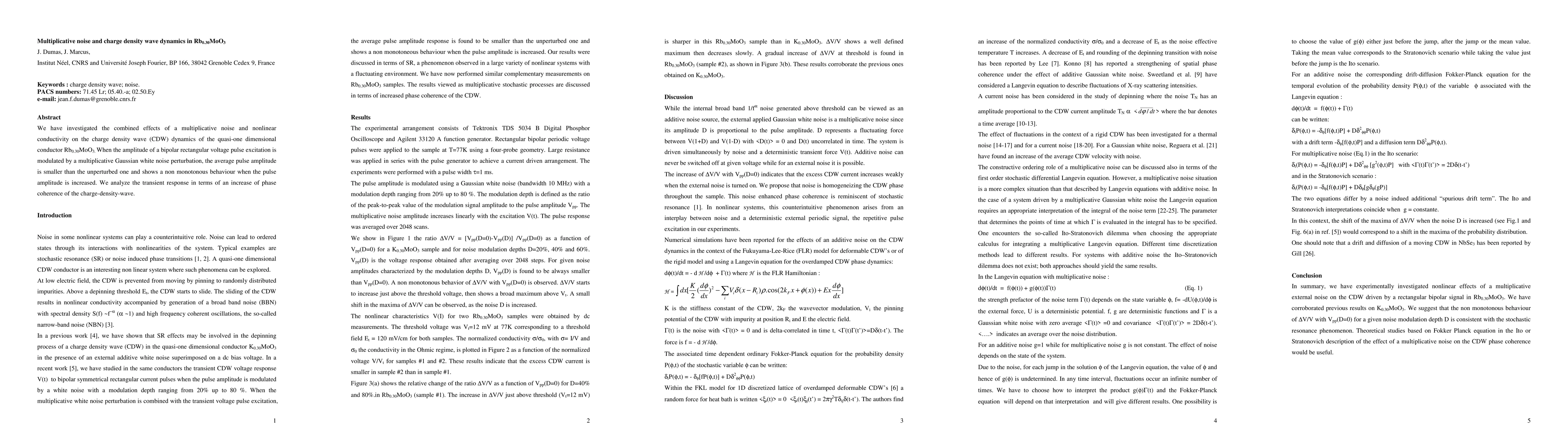 We have investigated the combined effects of a multiplicative noise and nonlinear conductivity on the charge density wave (CDW) dynamics of the quasi-one dimensional conductor Rb0.30MoO3. When the amplitude of a bipolar rectangular voltage pulse excitation is modulated by a multiplicative Gaussian white noise perturbation, the average pulse amplitude is smaller than the unperturbed one and shows a non monotonous behaviour when the pulse amplitude is increased. We analyze the transient response in terms of an increase of phase coherence of the charge-density-wave.