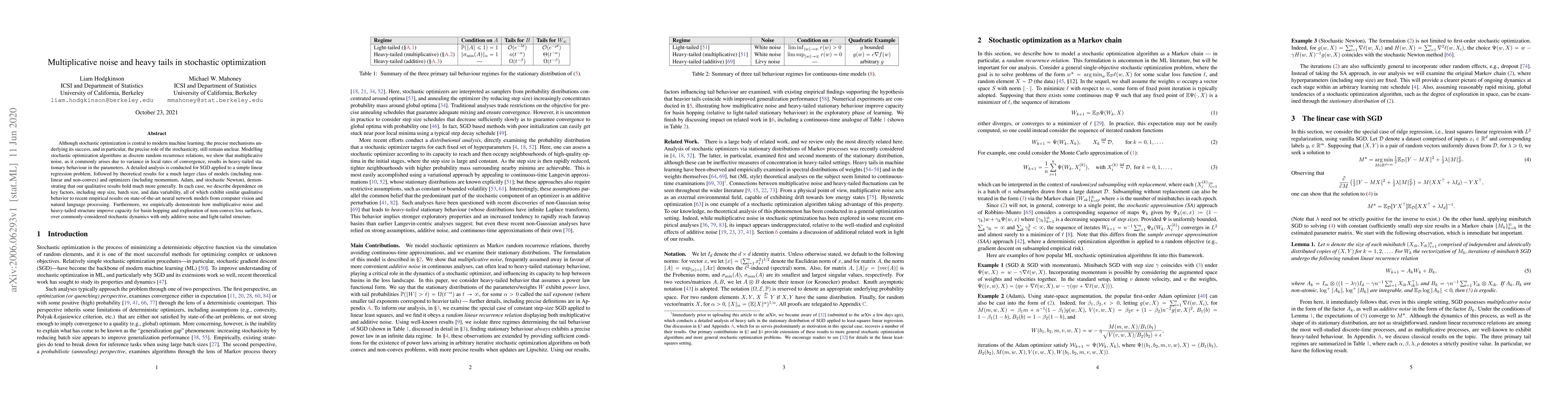 Although stochastic optimization is central to modern machine learning, the precise mechanisms underlying its success, and in particular, the precise role of the stochasticity, still remain unclear. Modelling stochastic optimization algorithms as discrete random recurrence relations, we show that multiplicative noise, as it commonly arises due to variance in local rates of convergence, results in heavy-tailed stationary behaviour in the parameters. A detailed analysis is conducted for SGD applied to a simple linear regression problem, followed by theoretical results for a much larger class of models (including non-linear and non-convex) and optimizers (including momentum, Adam, and stochastic Newton), demonstrating that our qualitative results hold much more generally. In each case, we describe dependence on key factors, including step size, batch size, and data variability, all of which exhibit similar qualitative behavior to recent empirical results on state-of-the-art neural network models from computer vision and natural language processing. Furthermore, we empirically demonstrate how multiplicative noise and heavy-tailed structure improve capacity for basin hopping and exploration of non-convex loss surfaces, over commonly-considered stochastic dynamics with only additive noise and light-tailed structure.