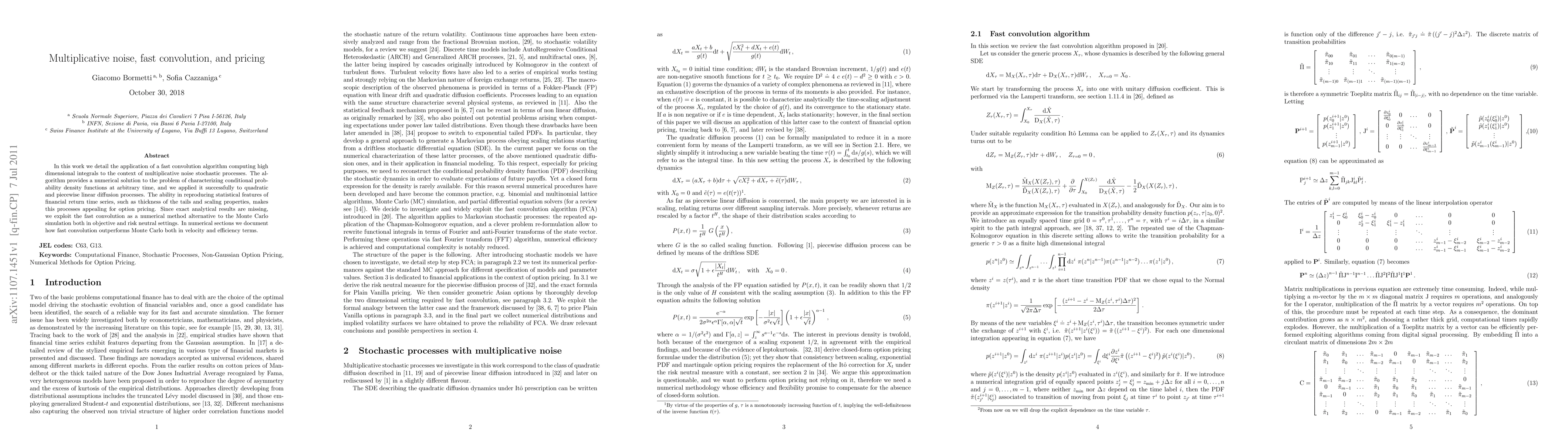 In this work we detail the application of a fast convolution algorithm computing high dimensional integrals to the context of multiplicative noise stochastic processes. The algorithm provides a numerical solution to the problem of characterizing conditional probability density functions at arbitrary time, and we applied it successfully to quadratic and piecewise linear diffusion processes. The ability in reproducing statistical features of financial return time series, such as thickness of the tails and scaling properties, makes this processes appealing for option pricing. Since exact analytical results are missing, we exploit the fast convolution as a numerical method alternative to the Monte Carlo simulation both in objective and risk neutral settings. In numerical sections we document how fast convolution outperforms Monte Carlo both in velocity and efficiency terms.