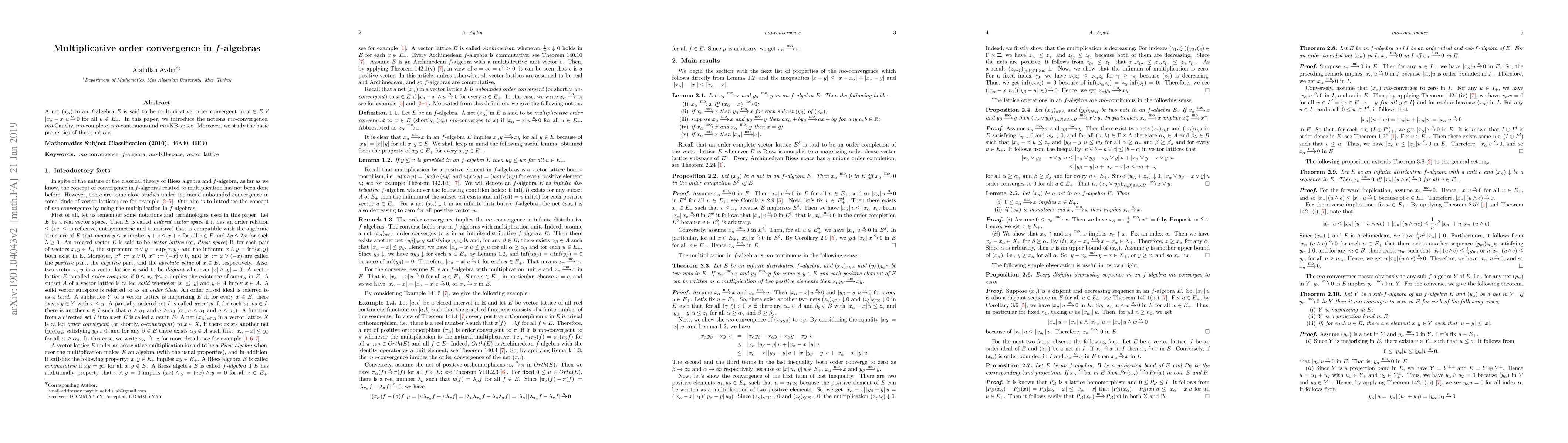 This paper introduces the concept of multiplicative order convergence in $f$-algebras, defining $mo$-convergence, $mo$-Cauchy, $mo$-complete, $mo$-continuous, and $mo$-KB-space, and explores their fundamental properties.