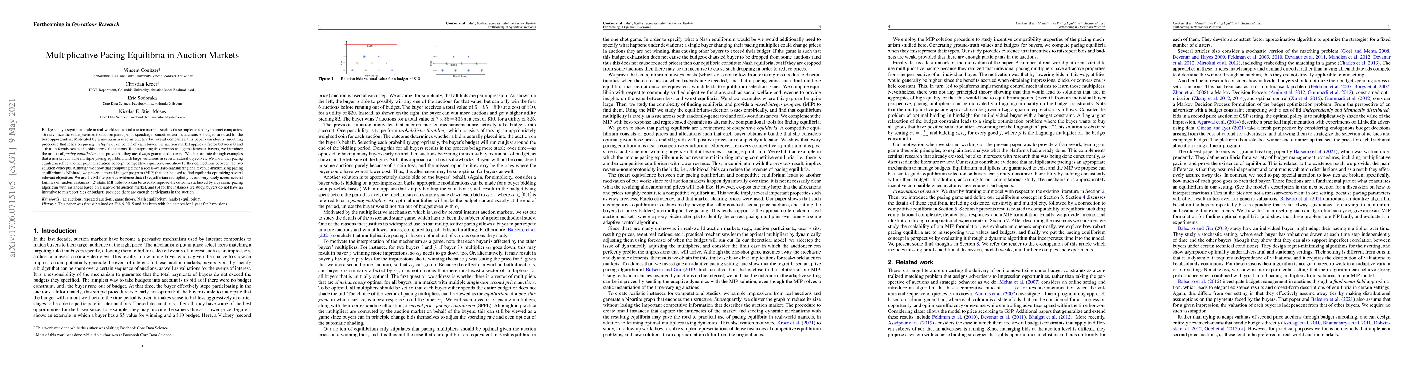 The paper introduces the notion of pacing equilibrium and proves its existence, along with a mixed-integer program (MIP) formulation to find equilibria optimizing various objectives in auction markets.