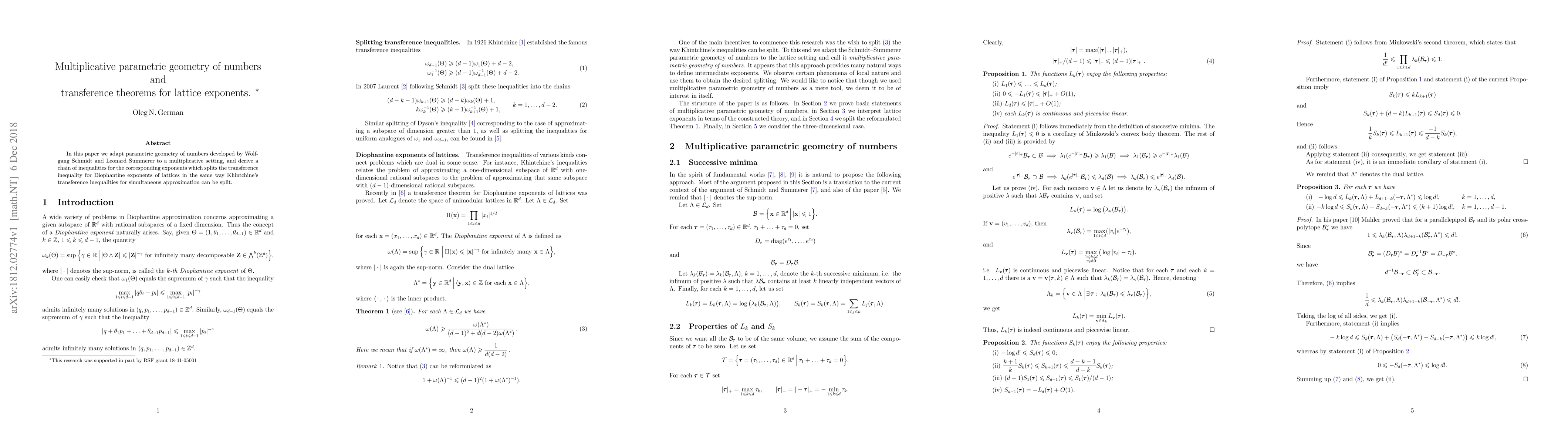 This paper adapts parametric geometry of numbers to a multiplicative framework, deriving a series of inequalities for lattice exponents and establishing a transference inequality akin to Khintchine's for simultaneous approximation.