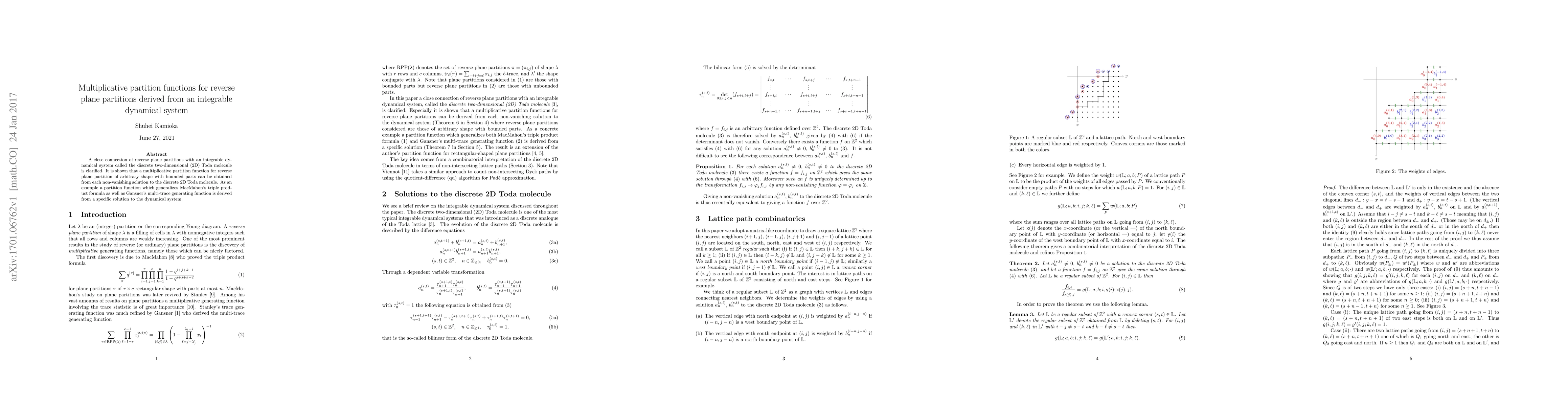 A new method is introduced to derive multiplicative partition functions for reverse plane partitions from an integrable dynamical system called the discrete 2D Toda molecule.