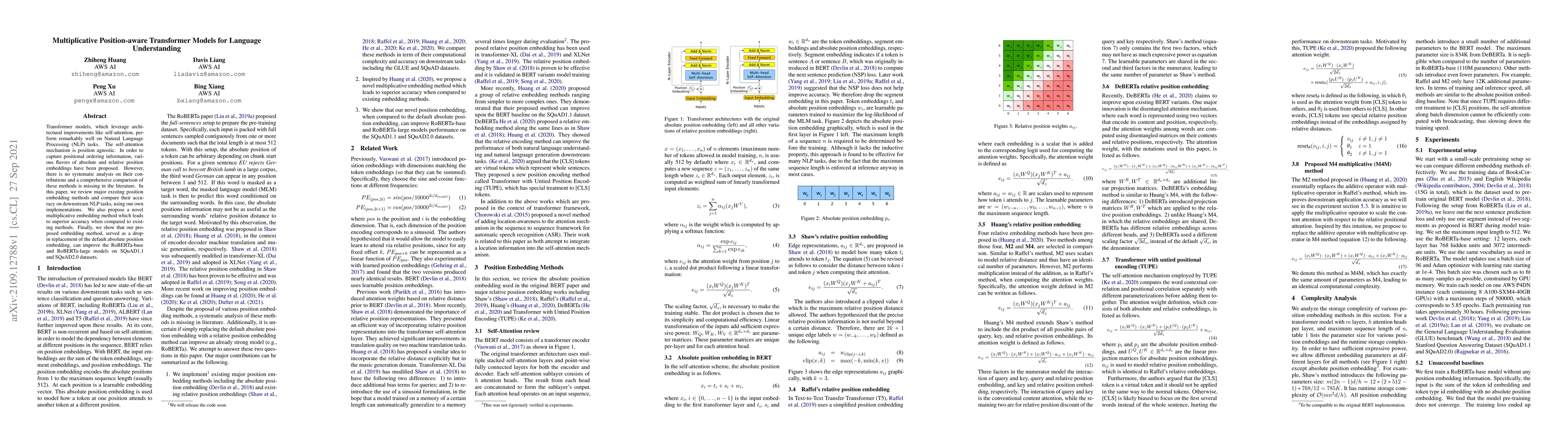 Transformer models, which leverage architectural improvements like self-attention, perform remarkably well on Natural Language Processing (NLP) tasks. The self-attention mechanism is position agnostic. In order to capture positional ordering information, various flavors of absolute and relative position embeddings have been proposed. However, there is no systematic analysis on their contributions and a comprehensive comparison of these methods is missing in the literature. In this paper, we review major existing position embedding methods and compare their accuracy on downstream NLP tasks, using our own implementations. We also propose a novel multiplicative embedding method which leads to superior accuracy when compared to existing methods. Finally, we show that our proposed embedding method, served as a drop-in replacement of the default absolute position embedding, can improve the RoBERTa-base and RoBERTa-large models on SQuAD1.1 and SQuAD2.0 datasets.