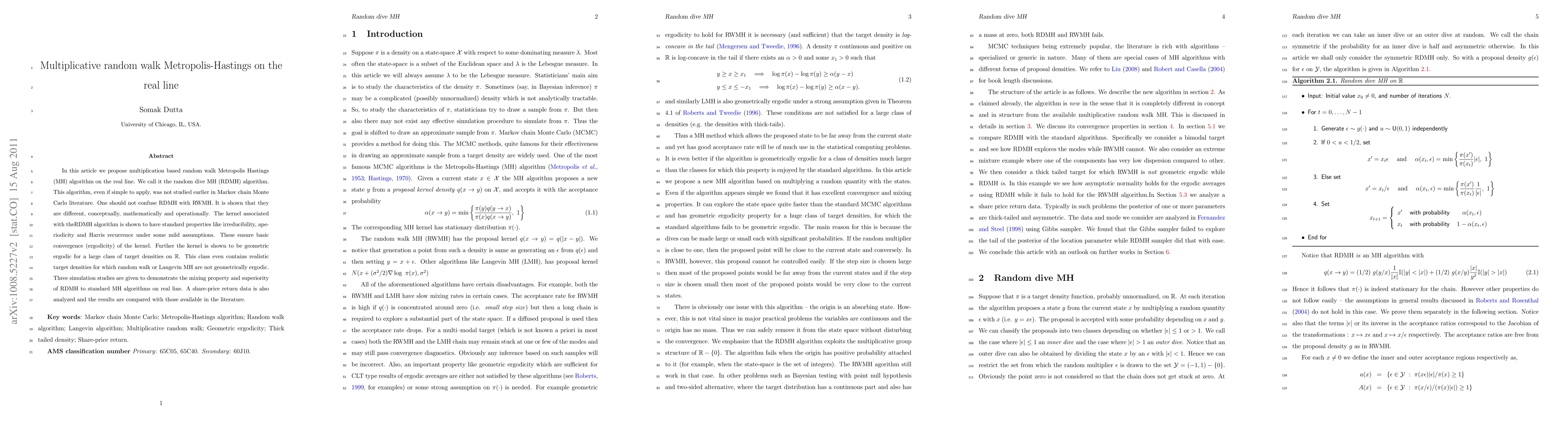 This paper introduces the Random Dive Metropolis-Hastings (RDMH) algorithm, a multiplicative random walk variant on the real line, demonstrating its irreducibility, aperiodicity, and geometric ergodicity for a broad class of target densities. Simulation studies and an analysis of share-price return data show RDMH's superior mixing properties compared to standard Metropolis-Hastings algorithms.