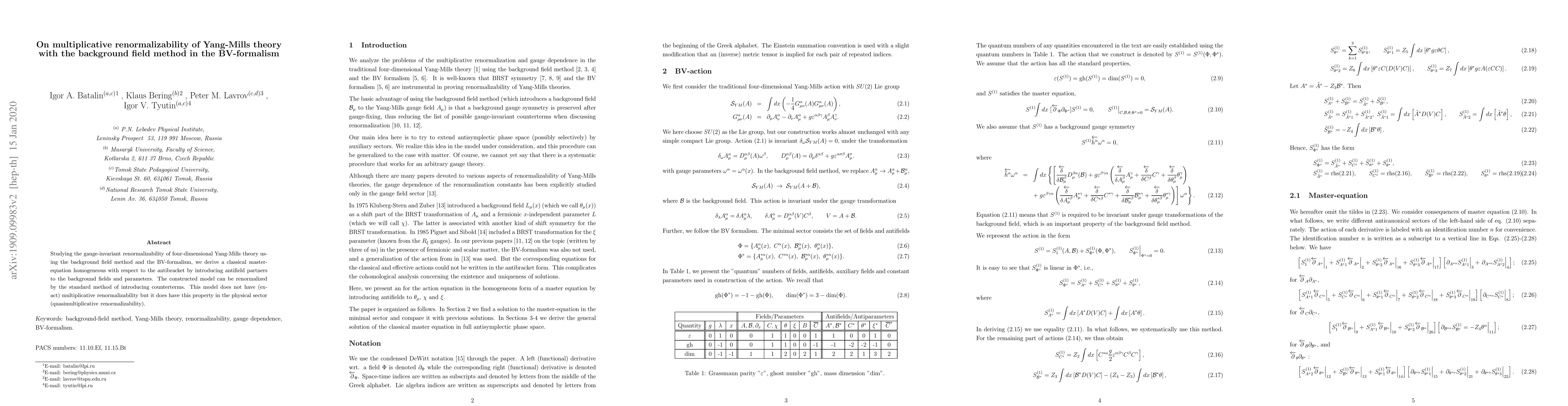Studying the gauge-invariant renormalizability of four-dimensional Yang-Mills theory using the background field method and the BV-formalism, we derive a classical master-equation homogeneous with respect to the antibracket by introducing antifield partners to the background fields and parameters. The constructed model can be renormalized by the standard method of introducing counterterms. This model does not have (exact) multiplicative renormalizability but it does have this property in the physical sector (quasimultiplicative renormalizability).