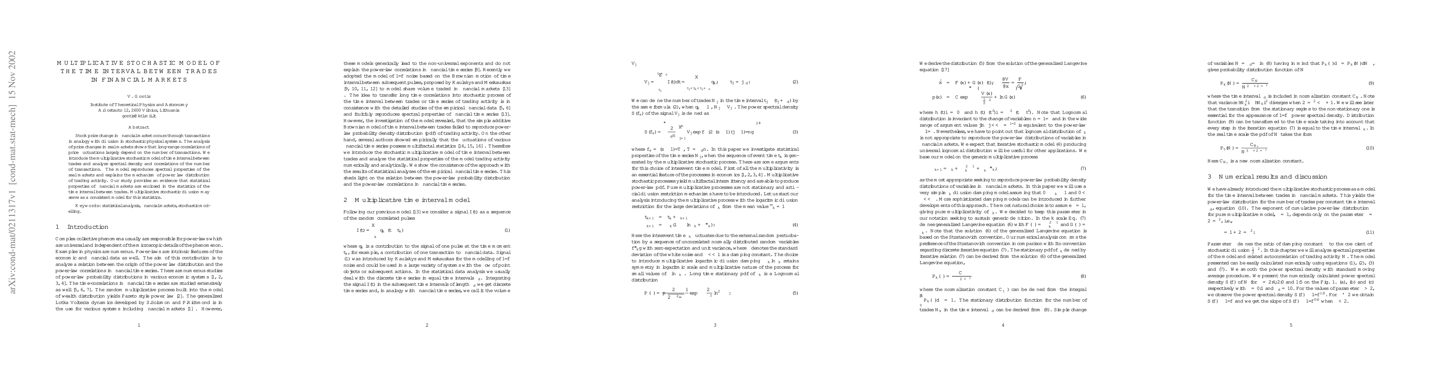 This paper introduces a multiplicative stochastic model to analyze the time interval between trades in financial markets, demonstrating that it reproduces the spectral properties of real markets and explains the power law distribution of trading activity, suggesting that the statistical properties of financial markets are embedded in the time interval statistics.