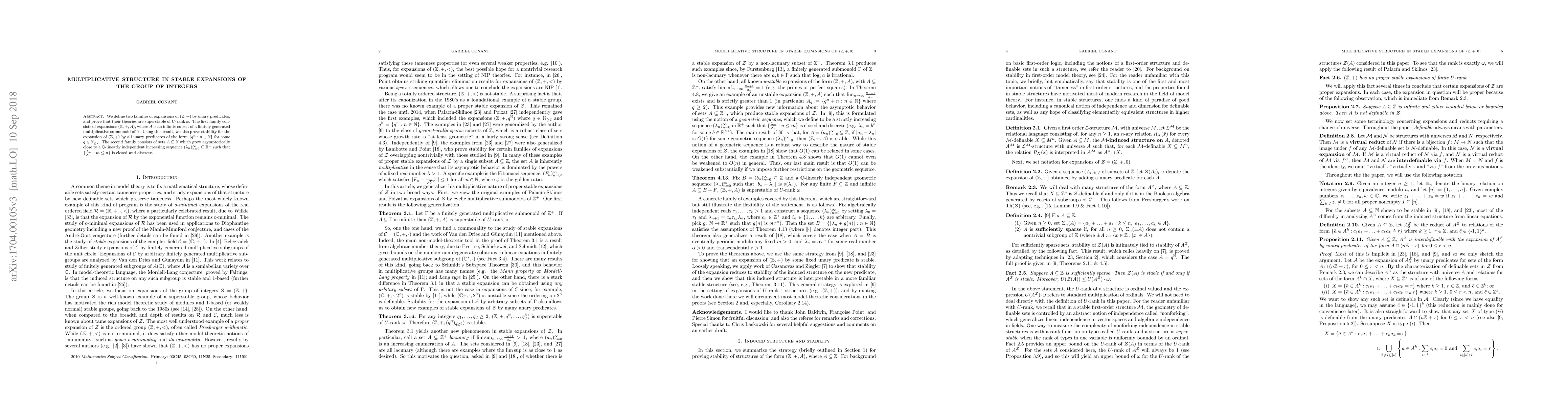 We define two families of expansions of $(\mathbb{Z},+,0)$ by unary predicates, and prove that their theories are superstable of $U$-rank $\omega$. The first family consists of expansions $(\mathbb{Z},+,0,A)$, where $A$ is an infinite subset of a finitely generated multiplicative submonoid of $\mathbb{N}$. Using this result, we also prove stability for the expansion of $(\mathbb{Z},+,0)$ by all unary predicates of the form $\{q^n:n\in\mathbb{N}\}$ for some $q\in\mathbb{N}_{\geq 2}$. The second family consists of sets $A\subseteq\mathbb{N}$ which grow asymptotically close to a $\mathbb{Q}$-linearly independent increasing sequence $(\lambda_n)_{n=0}^\infty\subseteq\mathbb{R}^+$ such that $\{\frac{\lambda_n}{\lambda_m}:m\leq n\}$ is closed and discrete.
