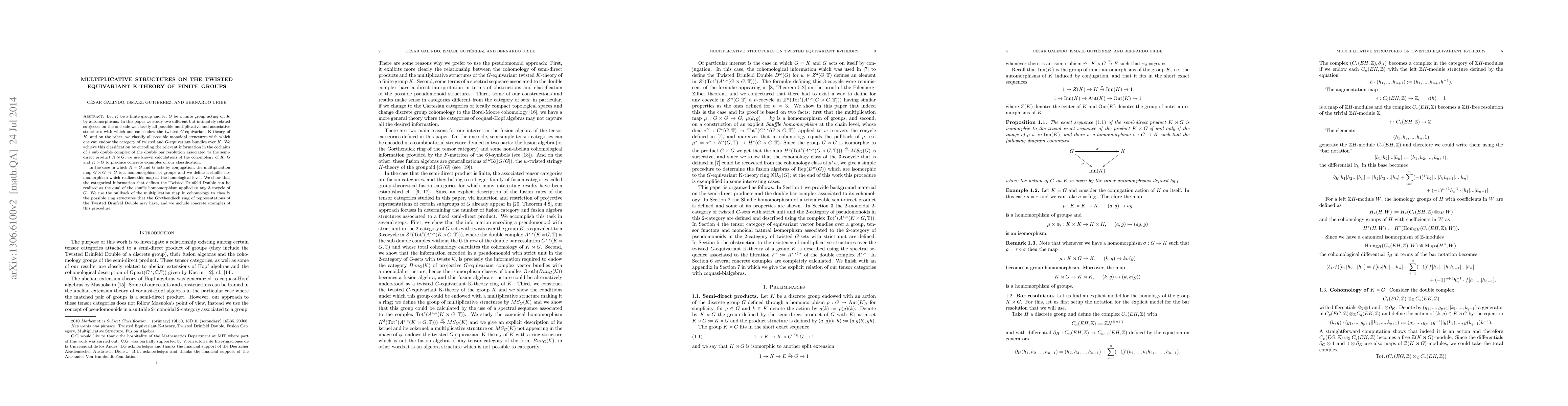 Let $K$ be a finite group and let $G$ be a finite group acting on $K$ by automorphisms. In this paper we study two different but intimately related subjects: on the one side we classify all possible multiplicative and associative structures with which one can endow the twisted $G$-equivariant K-theory of $K$, and on the other, we classify all possible monoidal structures with which one can endow the category of twisted and $G$-equivariant bundles over $K$. We achieve this classification by encoding the relevant information in the cochains of a sub double complex of the double bar resolution associated to the semi-direct product $K \rtimes G$; we use known calculations of the cohomology of $K$, $G$ and $K \rtimes G$ to produce concrete examples of our classification. In the case in which $K=G$ and $G$ acts by conjugation, the multiplication map $G \rtimes G \to G$ is a homomorphism of groups and we define a shuffle homomorphism which realizes this map at the homological level. We show that the categorical information that defines the Twisted Drinfeld Double can be realized as the dual of the shuffle homomorphism applied to any 3-cocycle of $G$. We use the pullback of the multiplication map in cohomology to classify the possible ring structures that the Grothendieck ring of representations of the Twisted Drinfeld Double may have, and we include concrete examples of this procedure.
