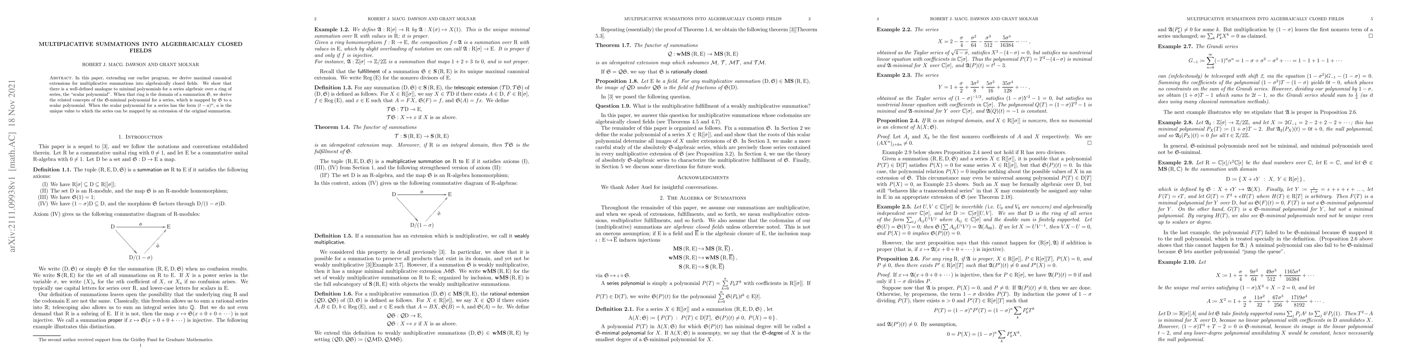 In this paper, extending our earlier program, we derive maximal canonical extensions for multiplicative summations into algebraically closed fields. We show that there is a well-defined analogue to minimal polynomials for a series algebraic over a ring of series, the "scalar polynomial". When that ring is the domain of a summation $\mathfrak{S}$, we derive the related concepts of the $\mathfrak{S}$-minimal polynomial for a series, which is mapped by $\mathfrak{S}$ to a scalar polynomial. When the scalar polynomial for a series has the form $(t-a)^n$, $a$ is the unique value to which the series can be mapped by an extension of the original summation.