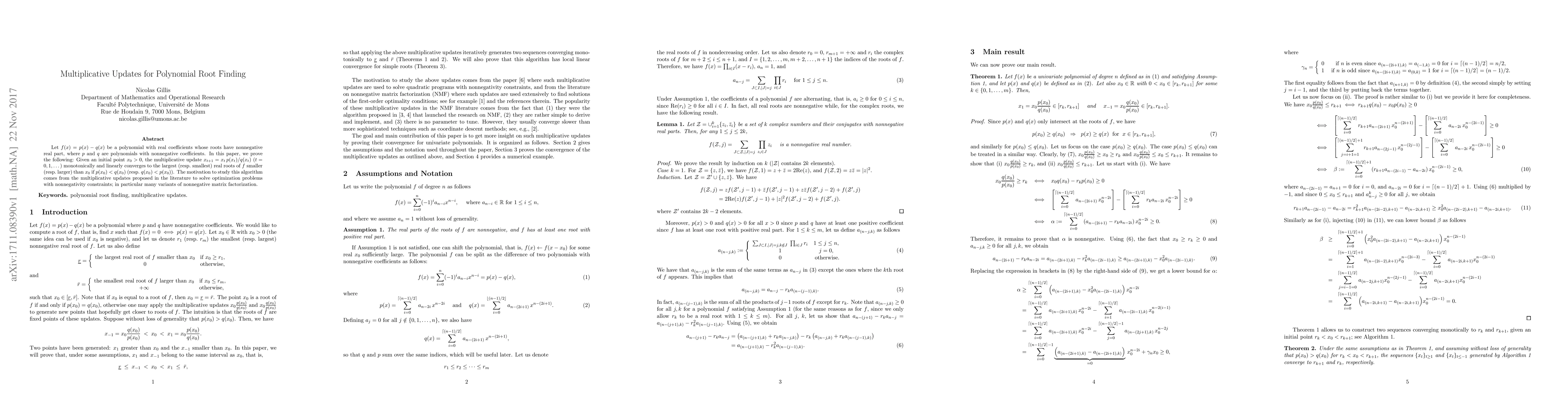 Let $f(x)=p(x)-q(x)$ be a polynomial with real coefficients whose roots have nonnegative real part, where $p$ and $q$ are polynomials with nonnegative coefficients. In this paper, we prove the following: Given an initial point $x_0 > 0$, the multiplicative update $x_{t+1} = x_t \, p(x_t)/q(x_t)$ ($t=0,1,\dots$) monotonically and linearly converges to the largest (resp. smallest) real roots of $f$ smaller (resp. larger) than $x_0$ if $p(x_0) < q(x_0)$ (resp. $q(x_0) < p(x_0)$). The motivation to study this algorithm comes from the multiplicative updates proposed in the literature to solve optimization problems with nonnegativity constraints; in particular many variants of nonnegative matrix factorization.